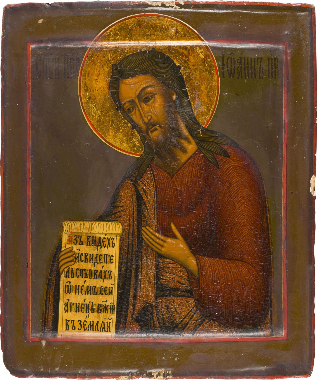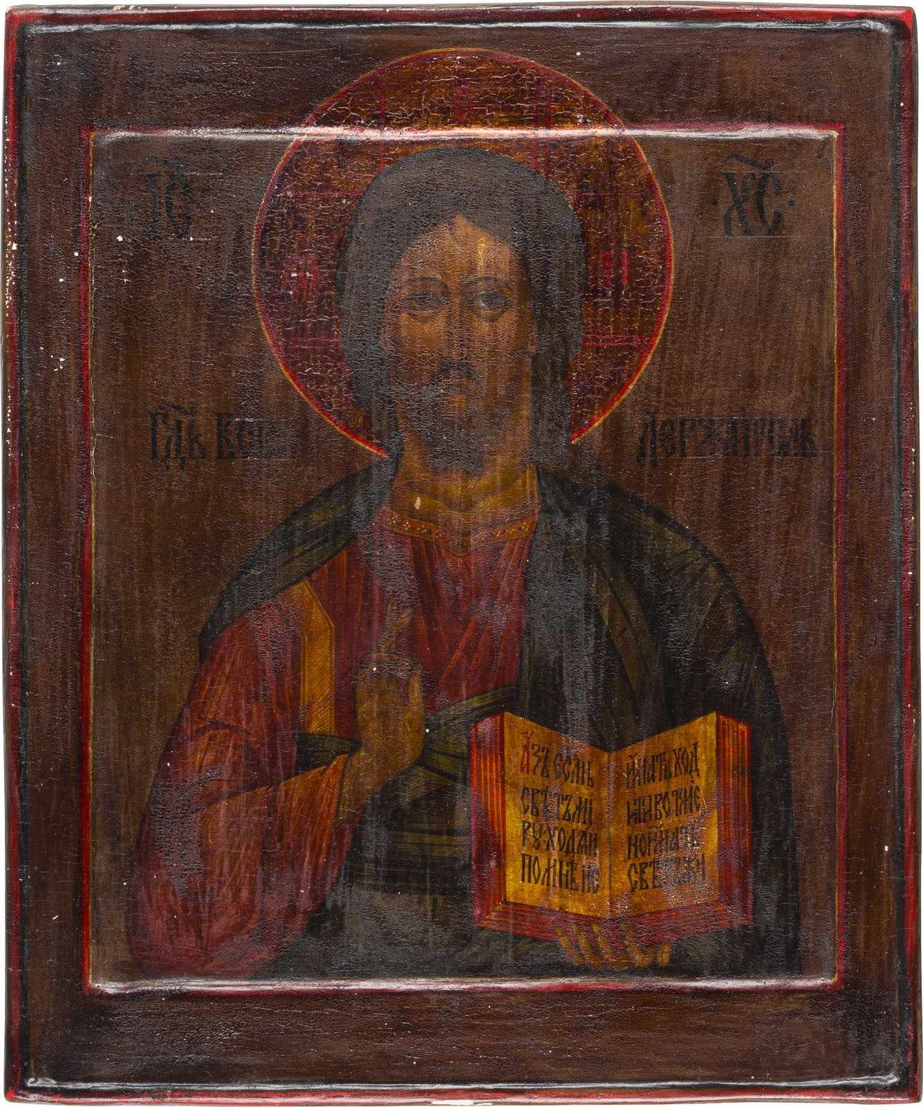 THREE PANELS FORMING A DEISIS Russian, 19th/20th century Tempera on wood panels with double kovcheg, haloes silvered and glazed in gold. Modern restorations. Each 33 x 26.2 cm.