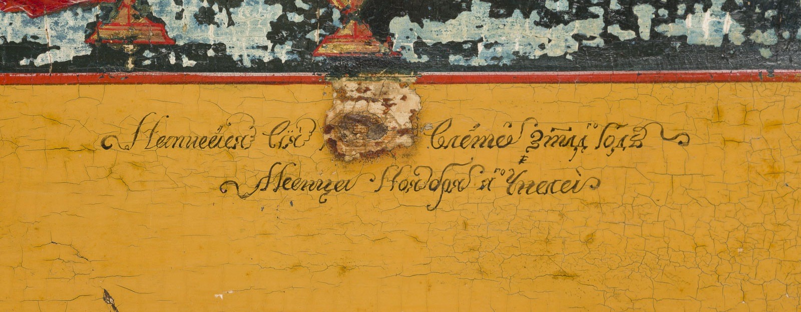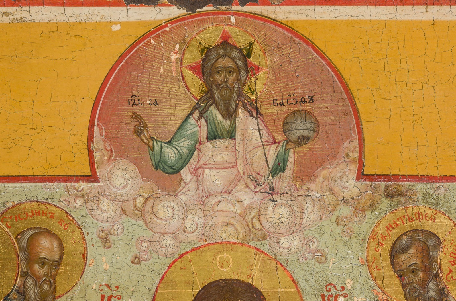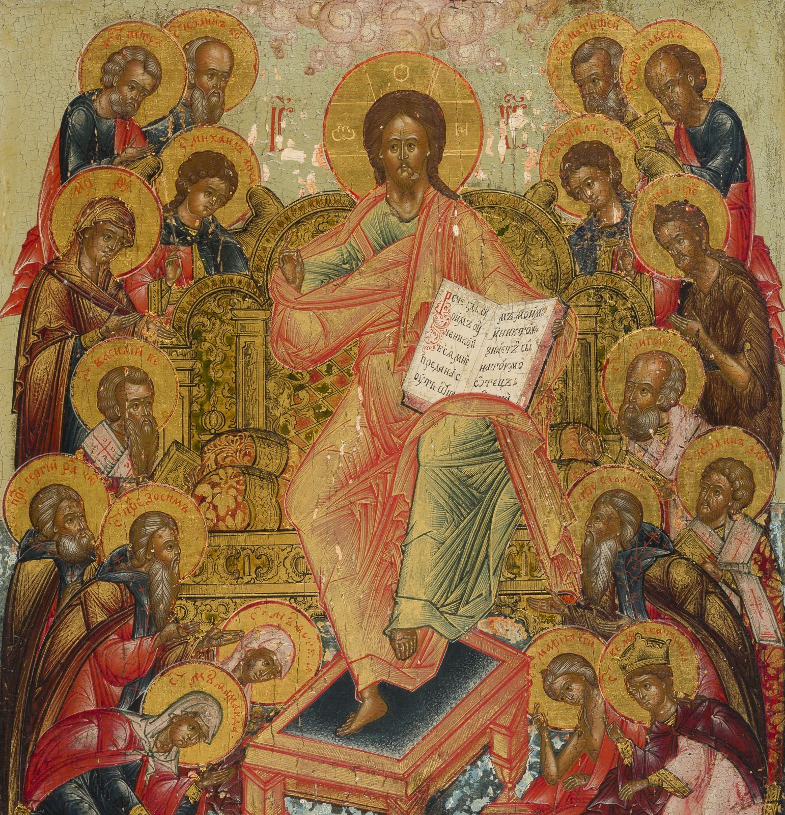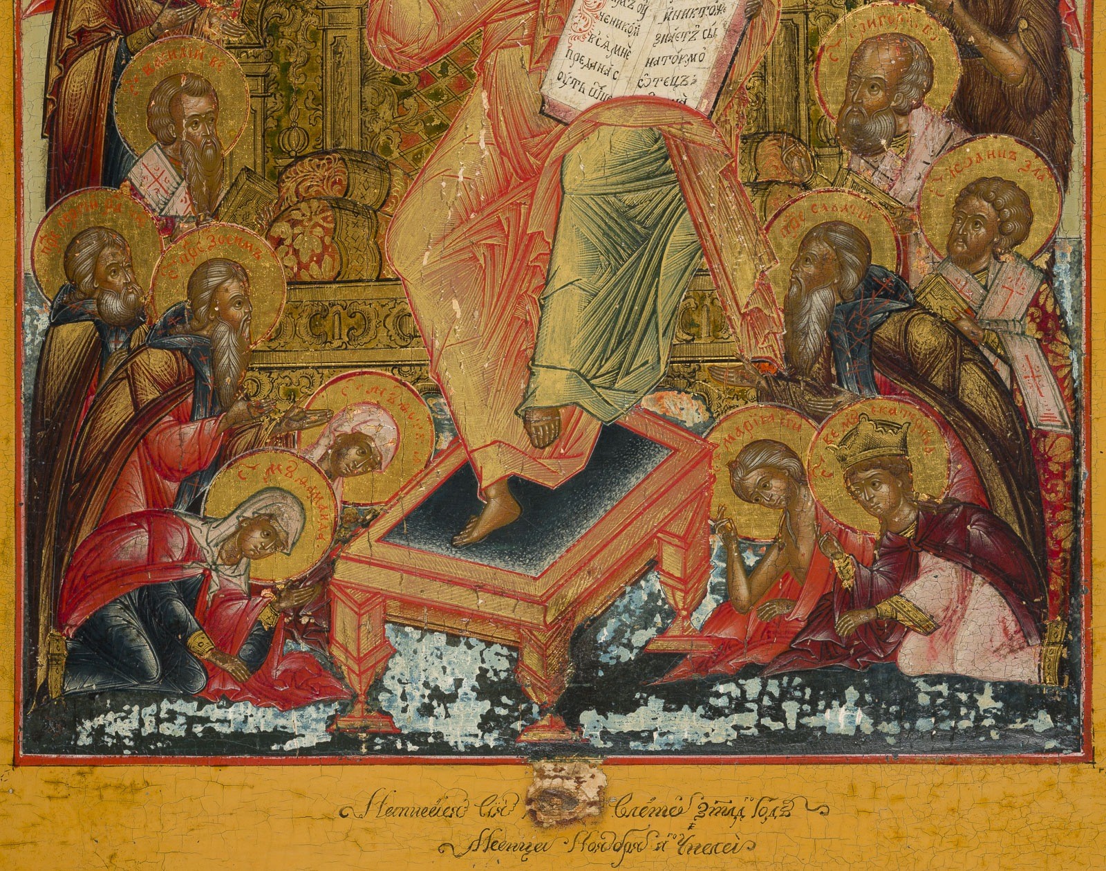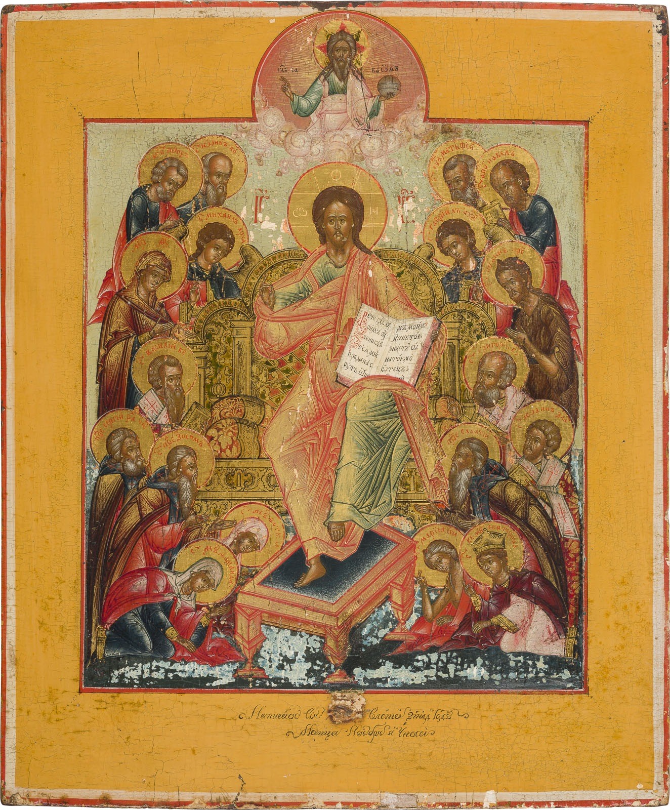 A FINE DATED ICON SHOWING THE EXTENDED DEISIS Russian, dated 1826 Tempera on wood panel with kovcheg. The haloes made of gold. Finely executed in great detail. Paint blisterings, losses. Cyrillic inscription and date '7334' on the lower border. 36 x 30.3 cm.