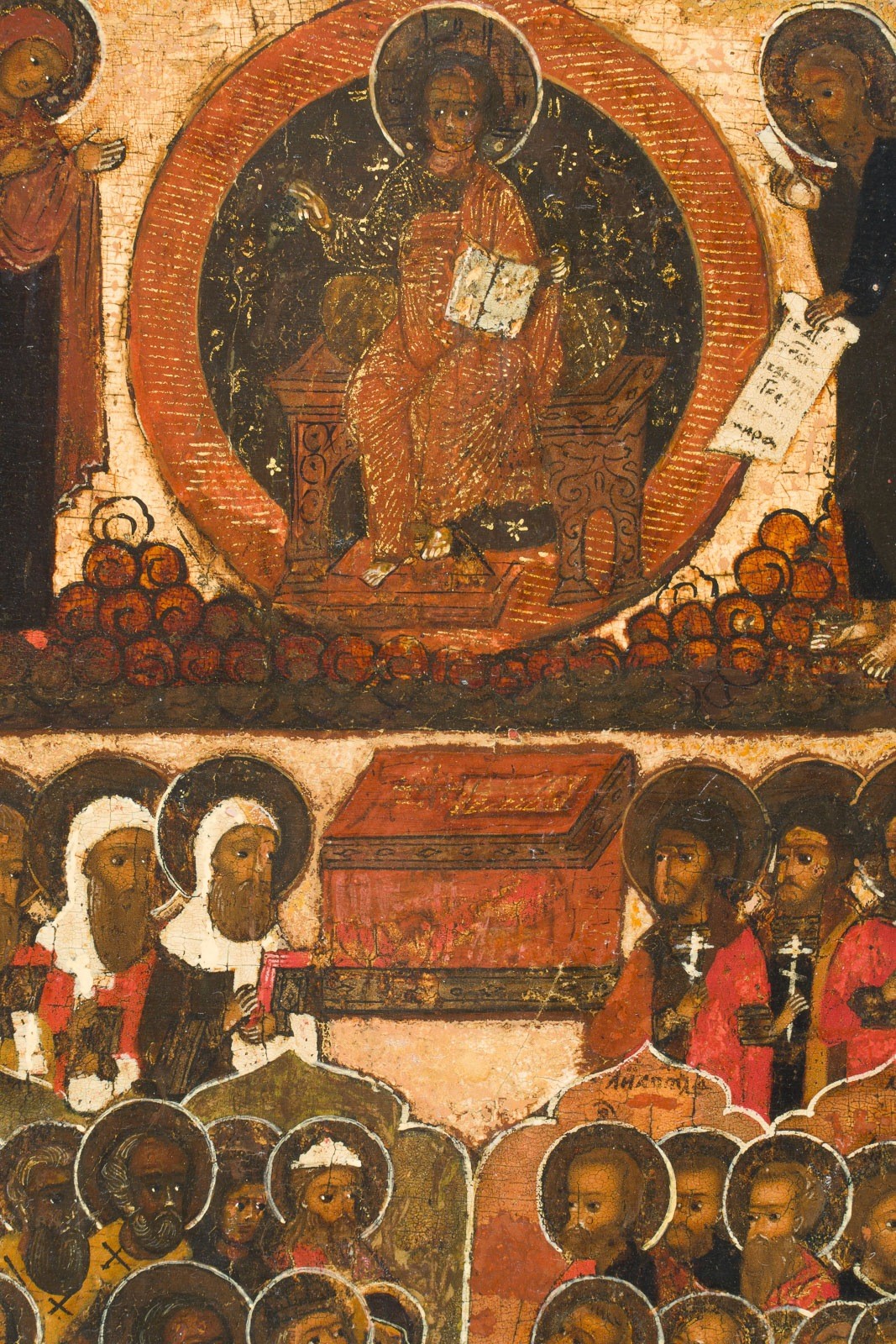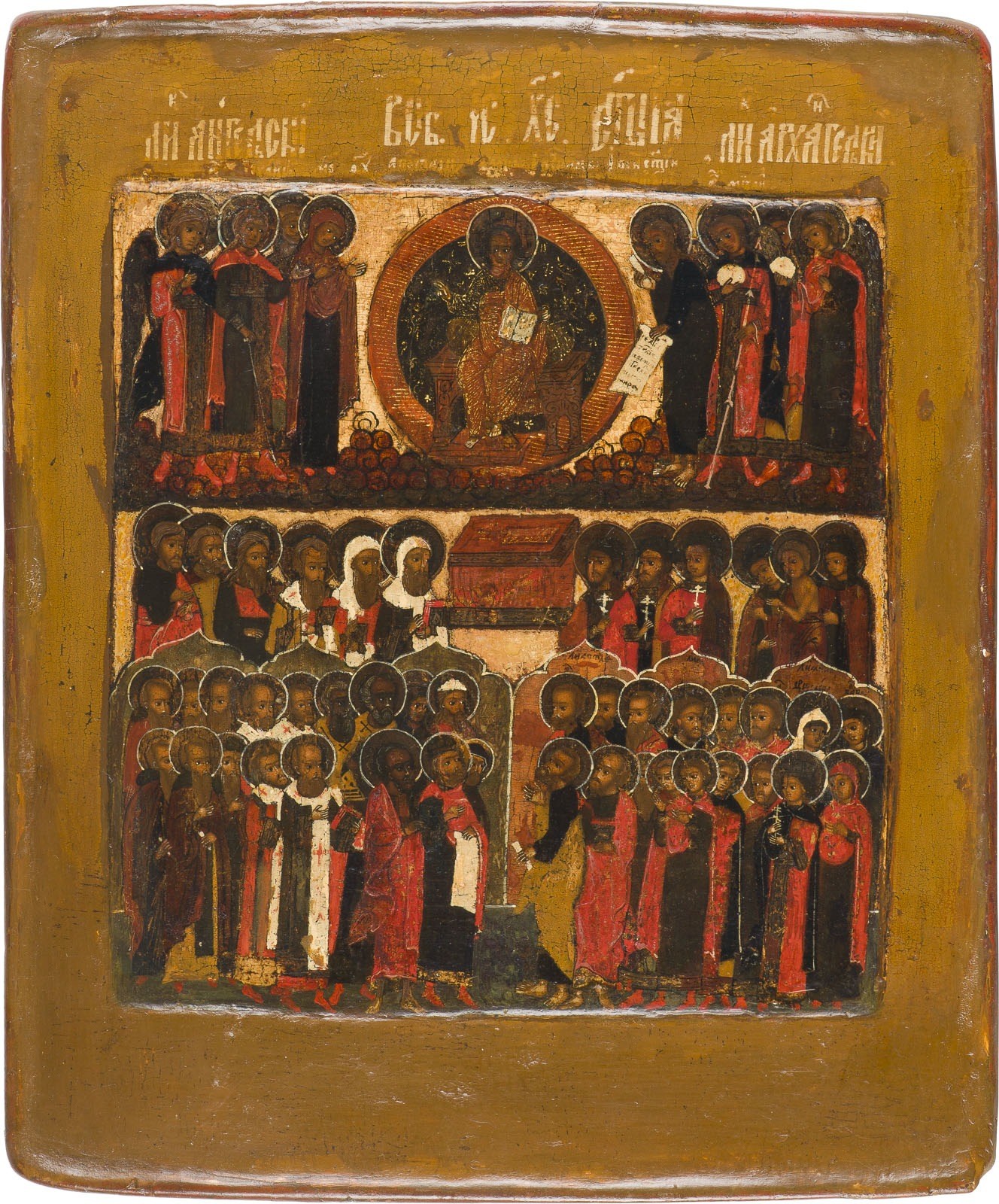 A FINE ICON OF 'ALL SAINTS' Russian, 17th century Tempera on wood panel with double kovcheg. Background stripped to gesso, partly restored. 31.3 x 27 cm. Provenance: Galerie Ilas Neufert, Munich (1974), cat. 72.