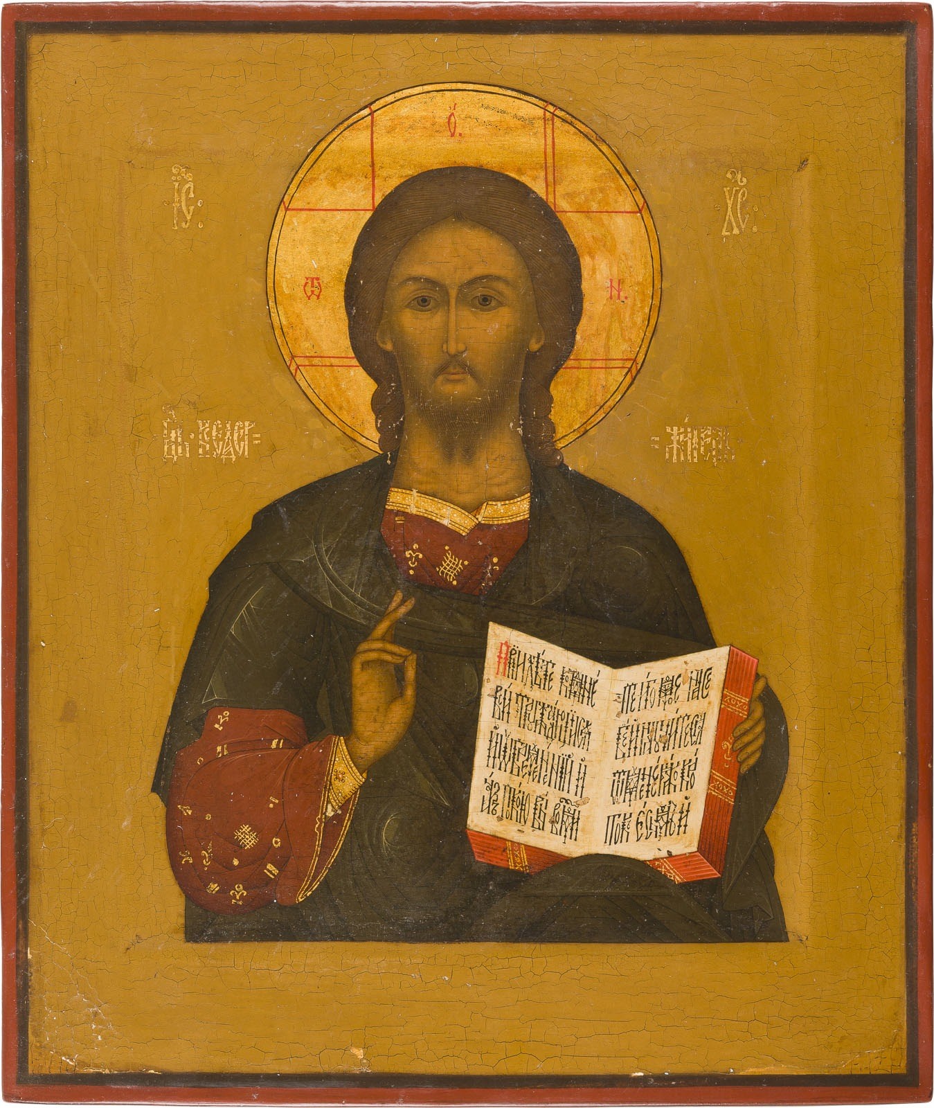 A FINE ICON SHOWING CHRIST PANTOKRATOR Russian, early 19th century Tempera on wood panel with double kovcheg. The halo and hems of the garments made of gold. Minimally restored. 30.8 x 26.5 cm.