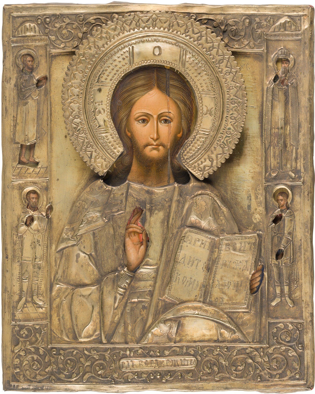 A FINE ICON SHOWING CHRIST PANTOKRATOR WITH OKLAD Russian, 2nd half of the 19th century Tempera on wood panel. The haloes and background made of gold. The brass oklad chased and repoussé with foliate bands. Four selected saints on the borders, Sts. Theodore and George among them. Vertical crack restored, the edges minimally chipped. 33.2 x 27 cm.