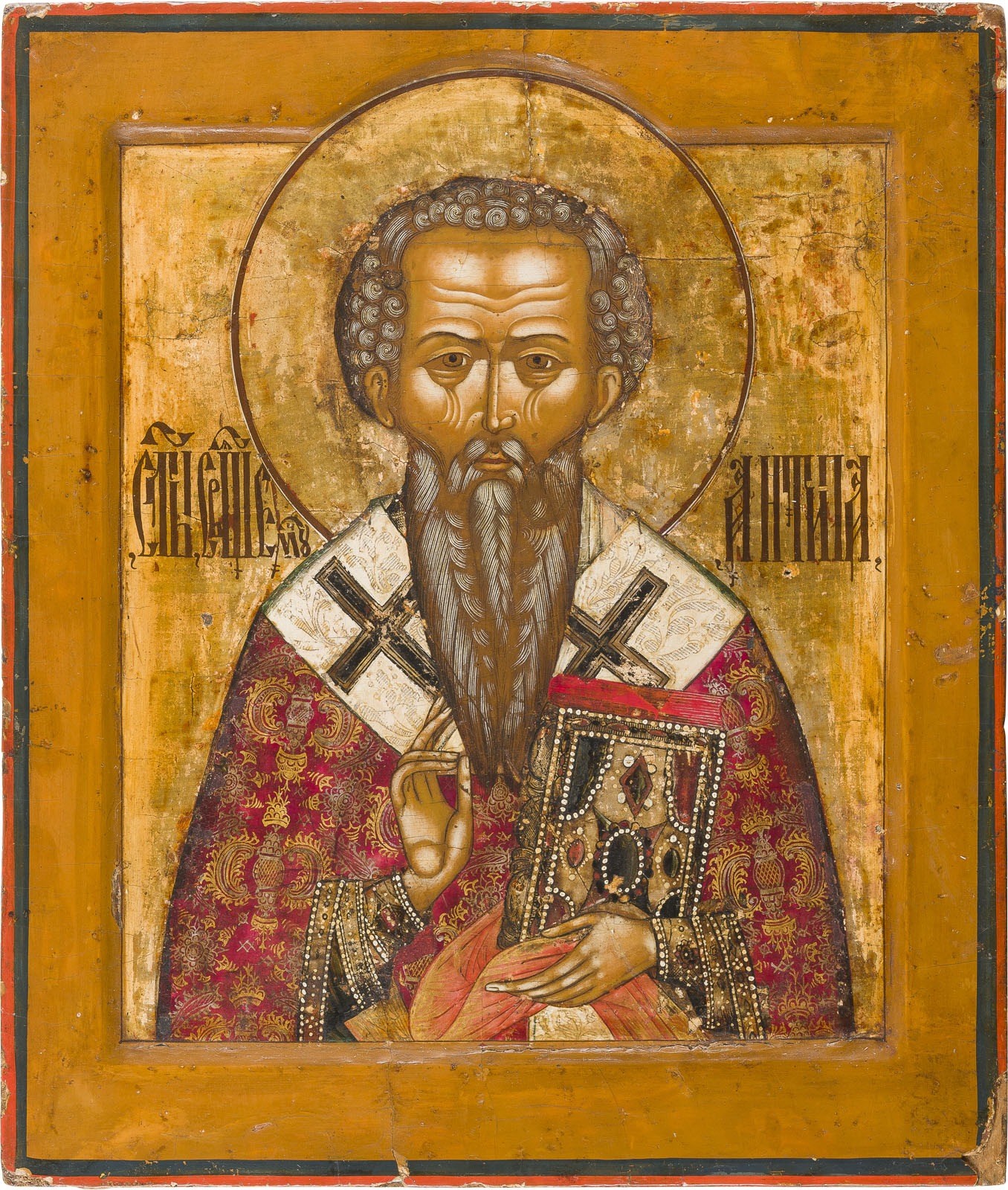 A FINE ICON SHOWING ST. ANTIPAS Russian, circa 1800 Tempera on wood panel with kovcheg. The background made of silver, covered by a golden lacquer. Minor areas of retouching. 30.7 x 26.2 cm.