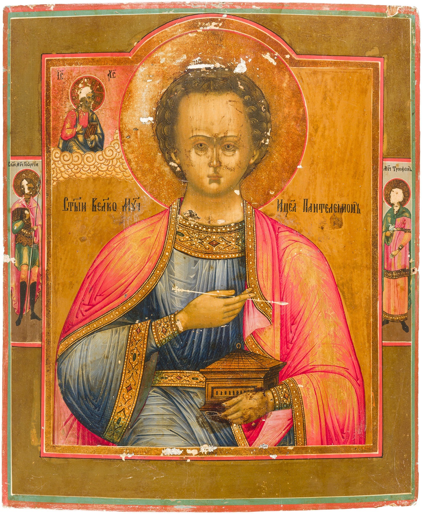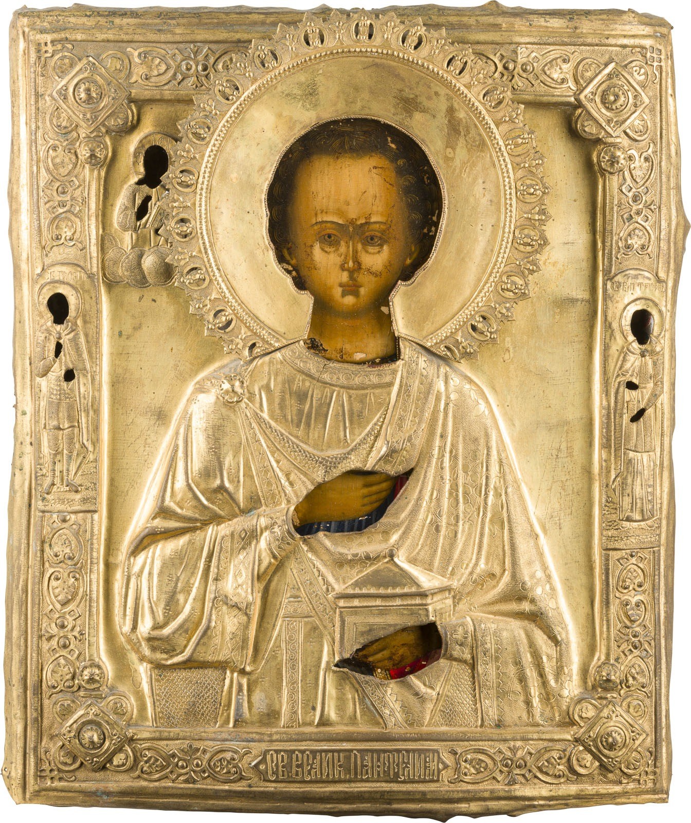A FINE ICON SHOWING ST. PANTELEIMON WITH OKLAD Russian, 2nd half of the 19th century Tempera on wood panel. The haloes made of silver, covered by a golden lacquer. Overlaid with a chased gilded brass oklad. Two selected saints on the borders: George and Triphon. Minor losses. 35.8 x 30 cm.