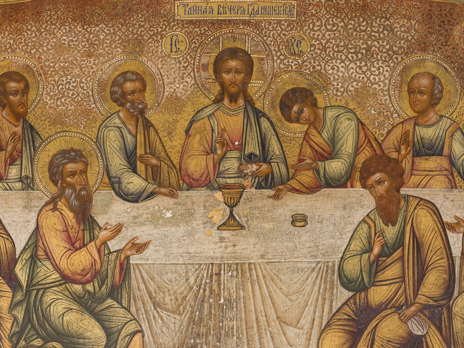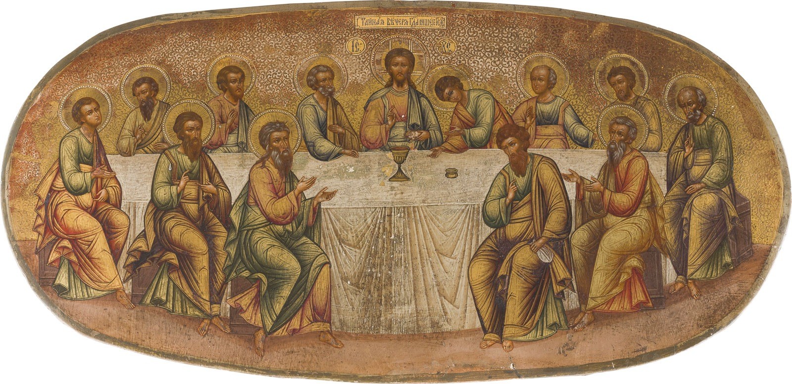 A FINE ICON SHOWING THE LAST SUPPER Russian, circa 1900 Tempera on wood panel. The garments highlighted with dense chrysography. Ornamental incised gilded background. Minor areas of retouching. 26.7 x 53.7 cm.
