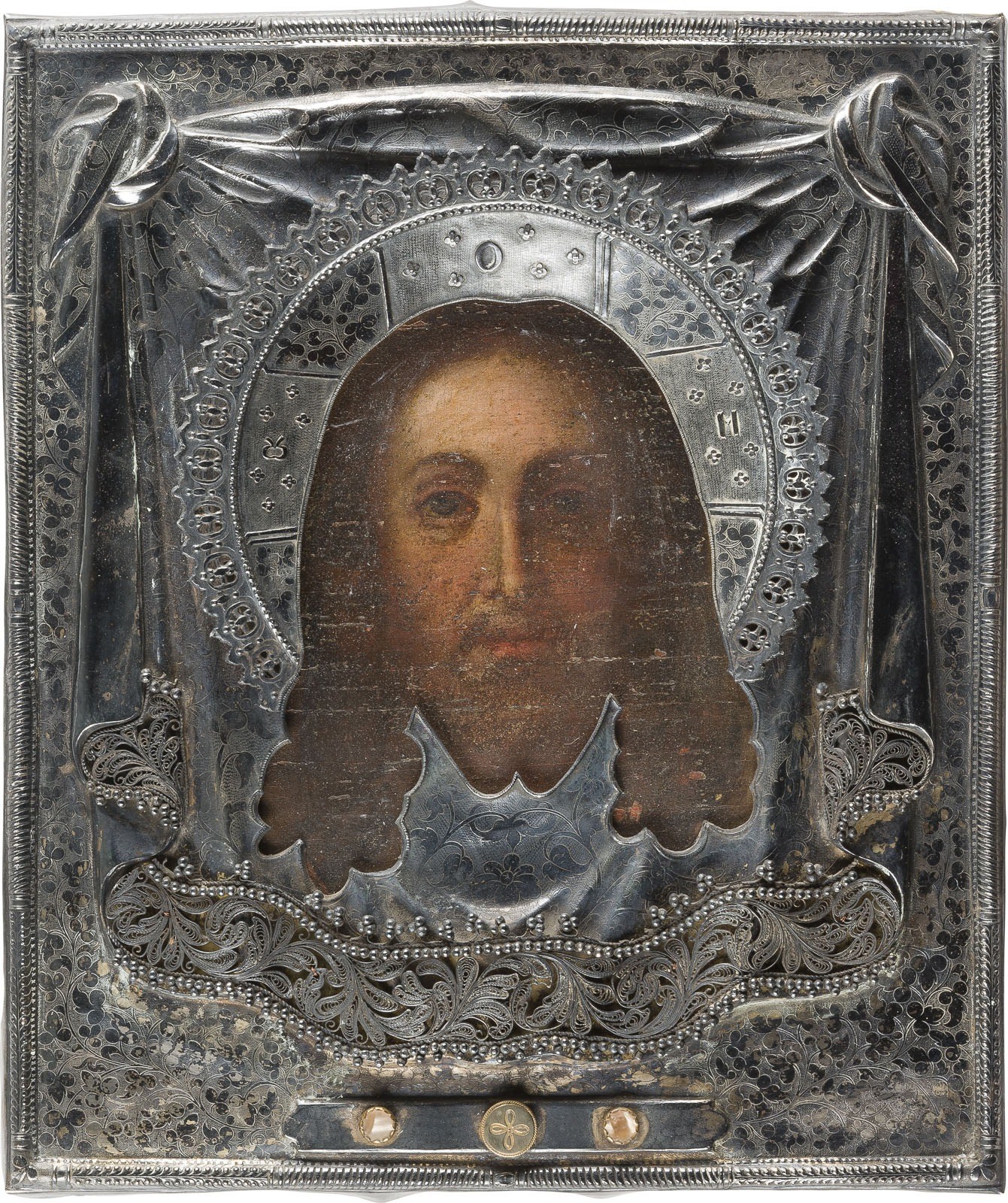 A FINE ICON SHOWING THE MANDYLION WITH A SILVER FILIGREE RIZA Russian, 19th century (icon), Russian, Moscow, Dmitriy Orlov, 1870 (riza) Oil on wood panel. The silver parcel-gilt riza repoussé and chased, the hems of the cloth in silver filigree. Struck with city hallmark, assayer's mark, maker's mark 'DO' in Cyrillic and 84 standard. 31.2 x 26.4 cm.
