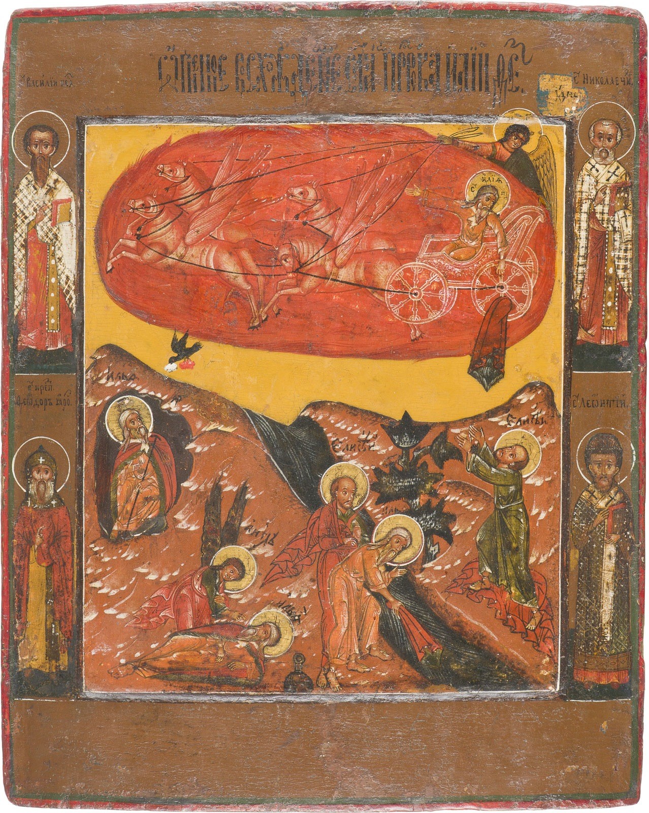 A FINE ICON SHOWING THE PROPHET ELIJAH, HIS LIFE IN THE WILDERNESS AND HIS FIERY ASCENT TO HEAVEN Russian, 17th century Tempera on wood panel with double kovcheg, haloes gilded. With four saints on the borders: St Basil, St Nicholas of Myra, St Theodore and St Leontius. Minor retouching. 33 x 26.7 cm.