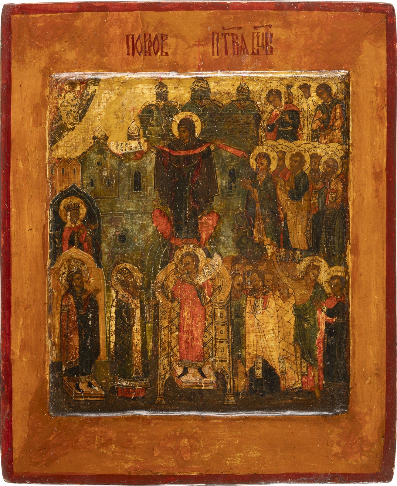 A FINE ICON SHOWING THE PROTECTING VEIL OF THE MOTHER OF GOD (POKROV) Russian, 1st half of the 17th century Tempera on wood panel with kovcheg. The haloes and background made of gold. Partially restored. 31.7 x 26.4 cm.