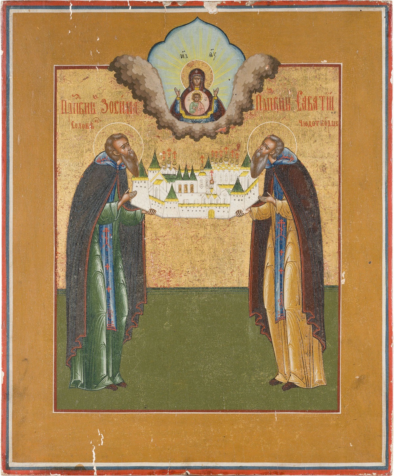 AN ICON SHOWING THE MONASTIC SAINTS ZOSIMA AND SAVATII, FOUNDERS OF THE SOLOVETSKI MONASTERY Russian, circa 1800 Tempera on wood panel. The two elderly saints wearing monkish attire, notably the Great Schema, holding a model of the walled monastery they founded. The Mother of God of the Sign depicted above in clouds. The faces rendered in great detail. The background gilded. Minor paint blisterings, minor losses. 35.7 x 29.5 cm.