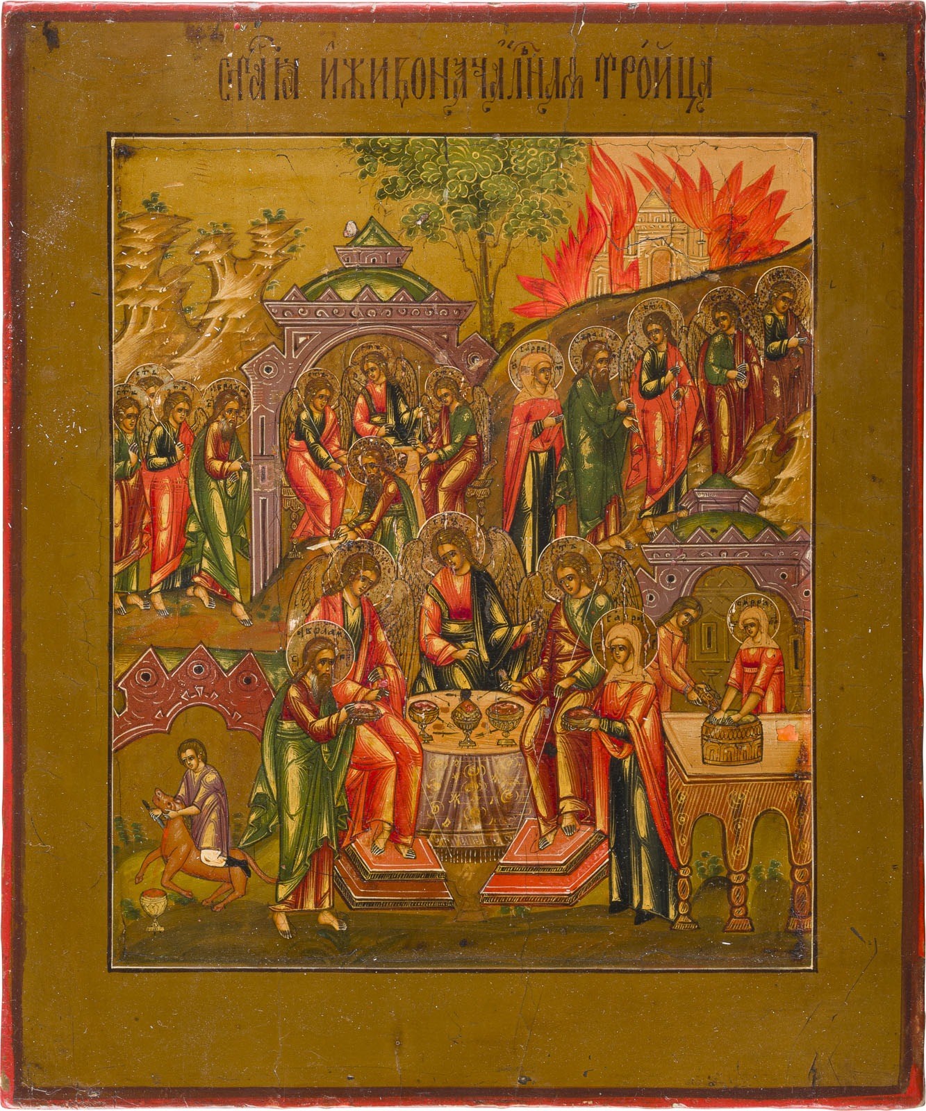 A FINE ICON SHOWING THE OLD TESTAMENT TRINITY Russian, 19th century Tempera on wood panel with kovcheg. The haloes made of silver, covered by a golden lacquer. Minor paint losses. 30.9 x 25.7 cm.