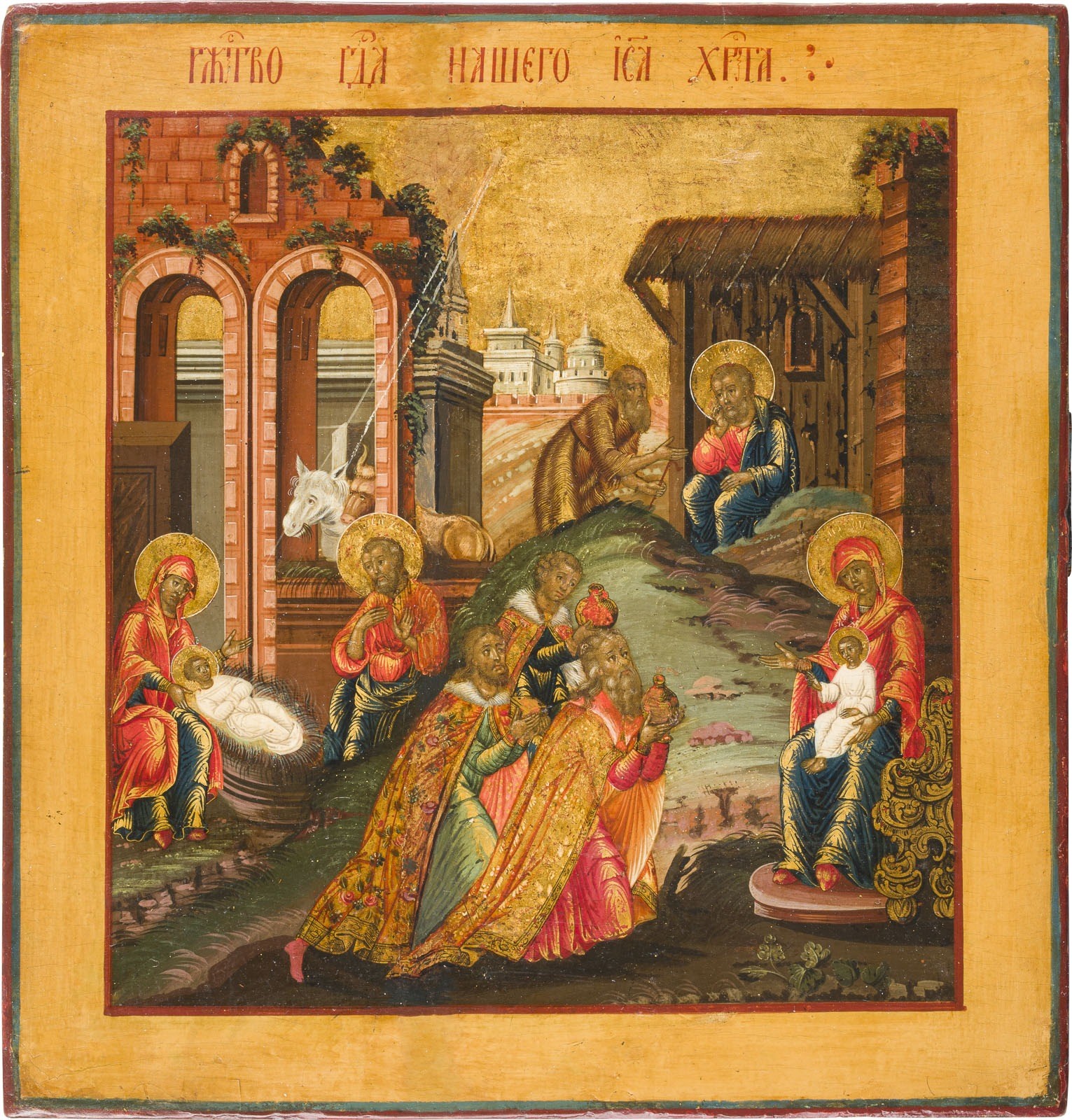 A FINE ICON SHOWING THE NATIVITY AND THE ADORATION OF CHRIST Russian, circa 1800 Tempera on wood panel. The haloes and background made of gold. Vertical crack partially restored. 27.5 x 26.1 cm.