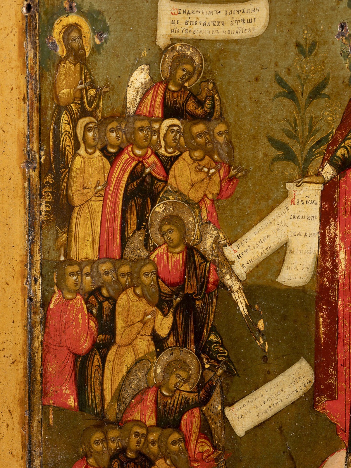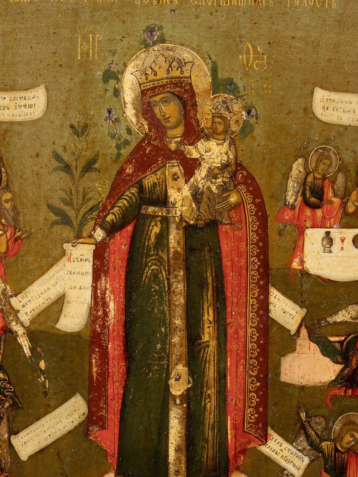 A FINE ICON SHOWING THE MOTHER OF GOD 'JOY TO ALL WHO GRIEVE' Russian, 18th century Tempera on wood panel with double kovcheg. The folds of the garments painted in gold. Minor areas of retouching. 30.2 x 26.4 cm.
