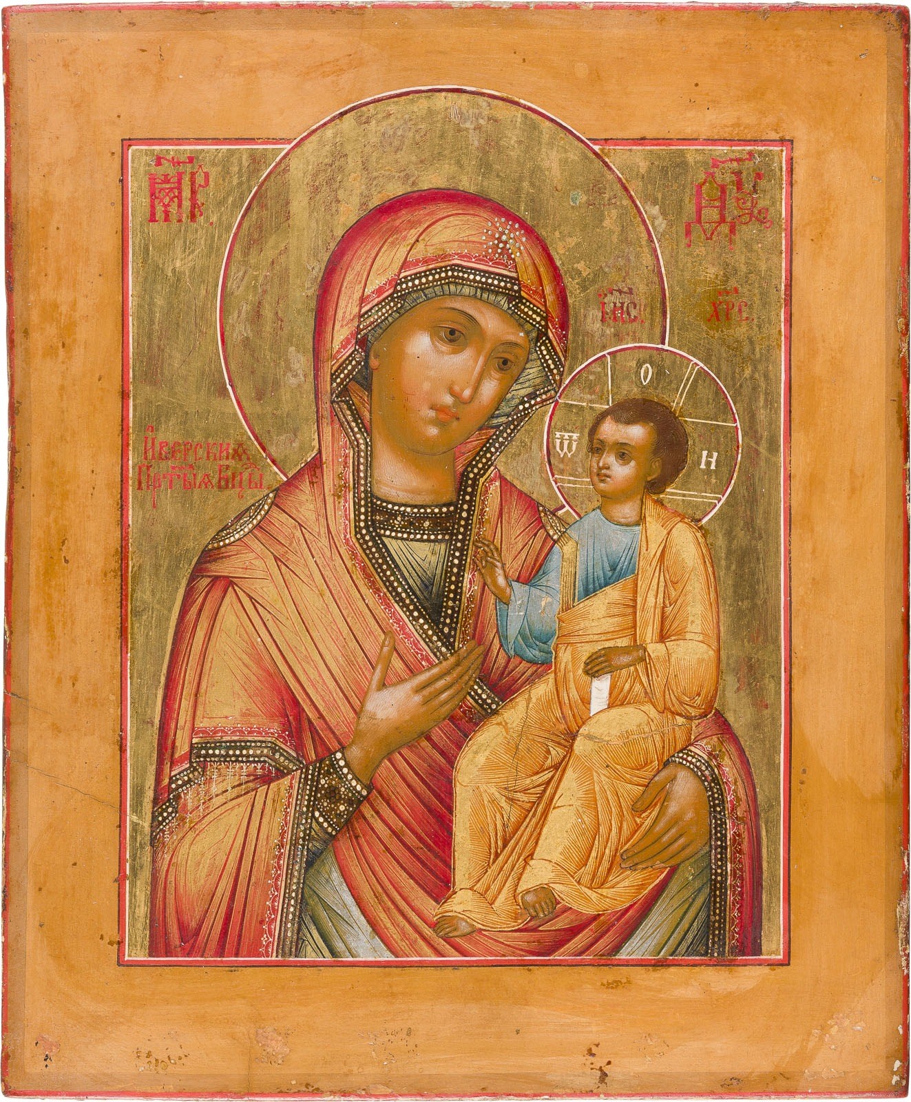 A FINE ICON SHOWING THE IVERSKAYA MOTHER OF GOD Central Russian, late 19th century Tempera on wood panel. Finely painted in great detail against a gold background. All decorated with intense chrysography. Minor areas of retouchung. 31 x 25.5 cm.