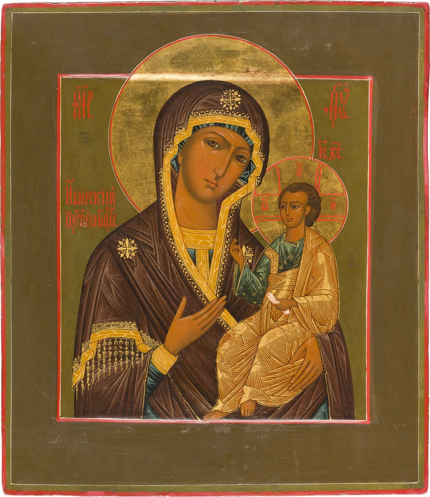 A FINE ICON SHOWING THE IVERSKAYA MOTHER OF GOD Russian, late 19th century Tempera on wood panel with kovcheg. The haloes made of gold. Christ's garments with chrysography. 30.8 x 27.1 cm.