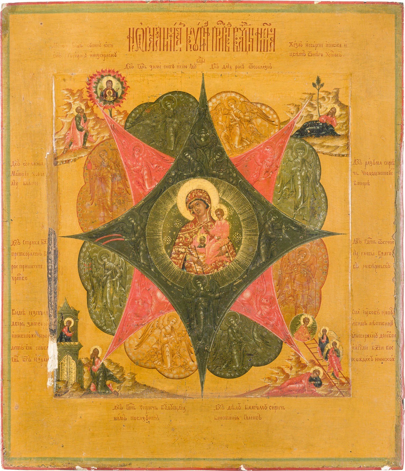 A FINE ICON SHOWING THE MOTHER OF GOD 'THE UNBURNT THORNBUSH' Russian, Palekh, circa 1800 Tempera on wood panel with kovcheg. The haloes made of gold. Minor paint losses, minimally restored. 35.9 x 31 cm.