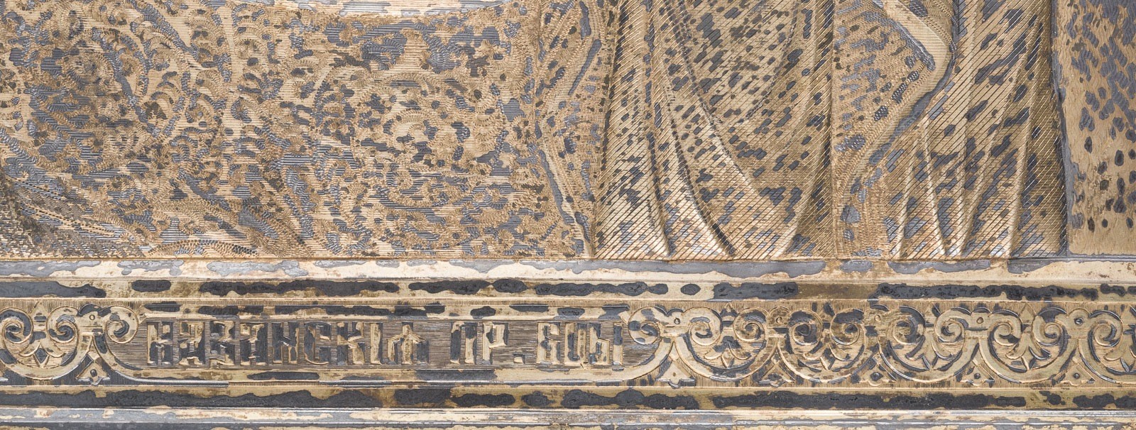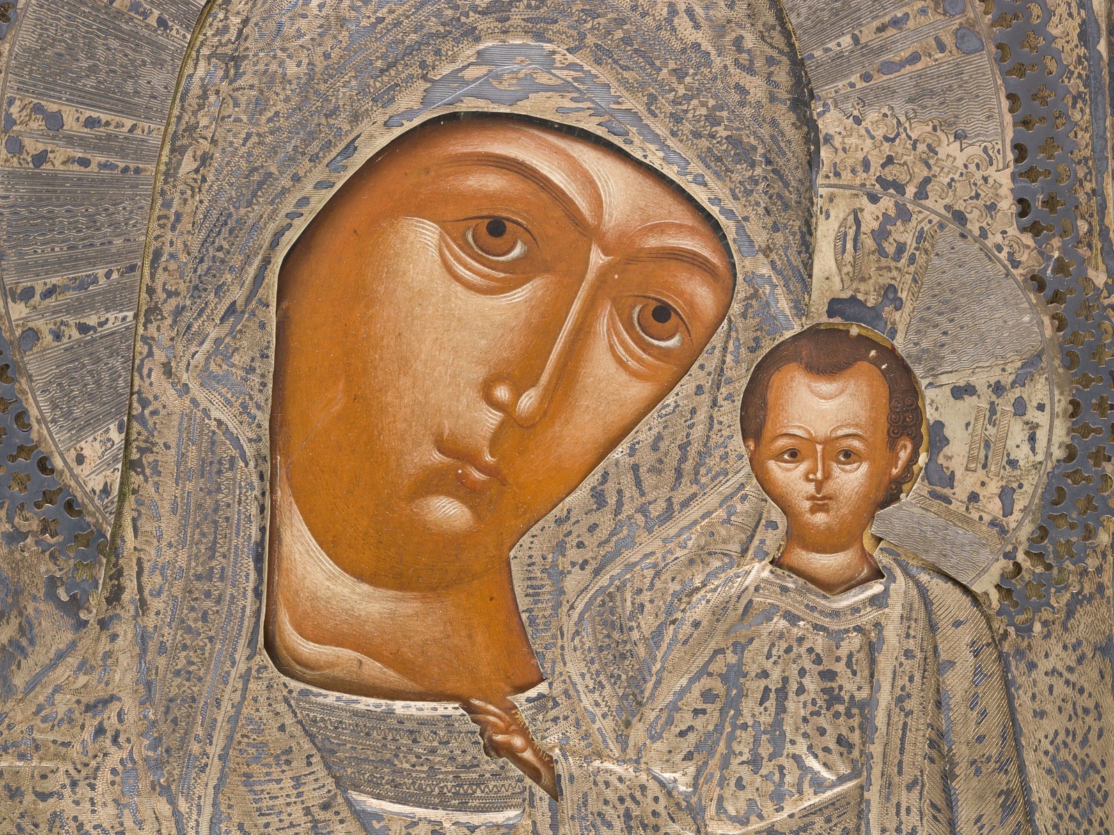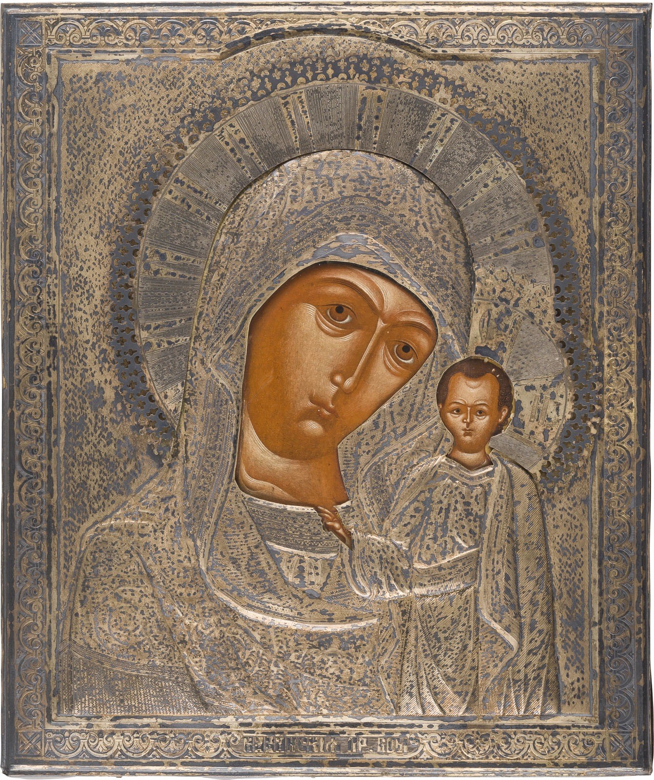 A FINE ICON SHOWING THE MOTHER OF GOD OF KAZAN WITH SILVER-GILT OKLAD Russian, late 19th century (icon), Russian, Moscow, Grigoriy Sbitnev, 1896 (oklad) Tempera on wood panel with velvet backing. The silver-gilt oklad finely engraved. Marked with city hallmark, assayer's mark, 84 standard and master's mark 'G.S.' in Cyrillic. 30.9 x 26.3 cm.