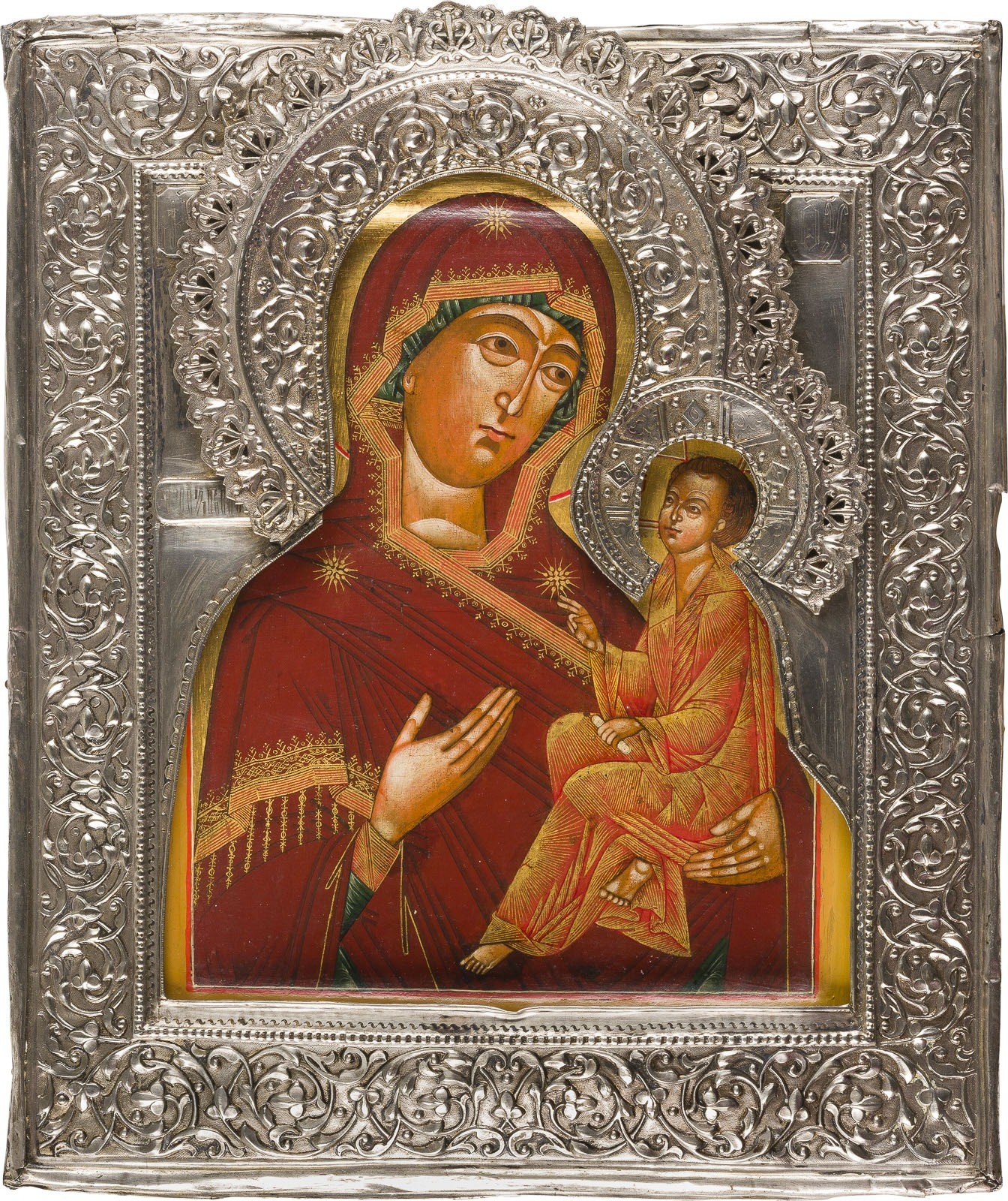 A FINE ICON SHOWING THE TIKHVINSKAYA MOTHER OF GOD WITH A SILVER RIZA Russian, late 19th century (icon), Russian, Moscow, 1874 (riza) Tempera on wood panel with kovcheg. Finely executed on a gold ground. Overlaid with a chased and embossed silver riza decorated with scrolling foliage. Marked with city hallmark, assayer's mark, 84 standard and master's mark. 26.5 x 21.5 cm (icon), 30.6 x 26 cm (riza).