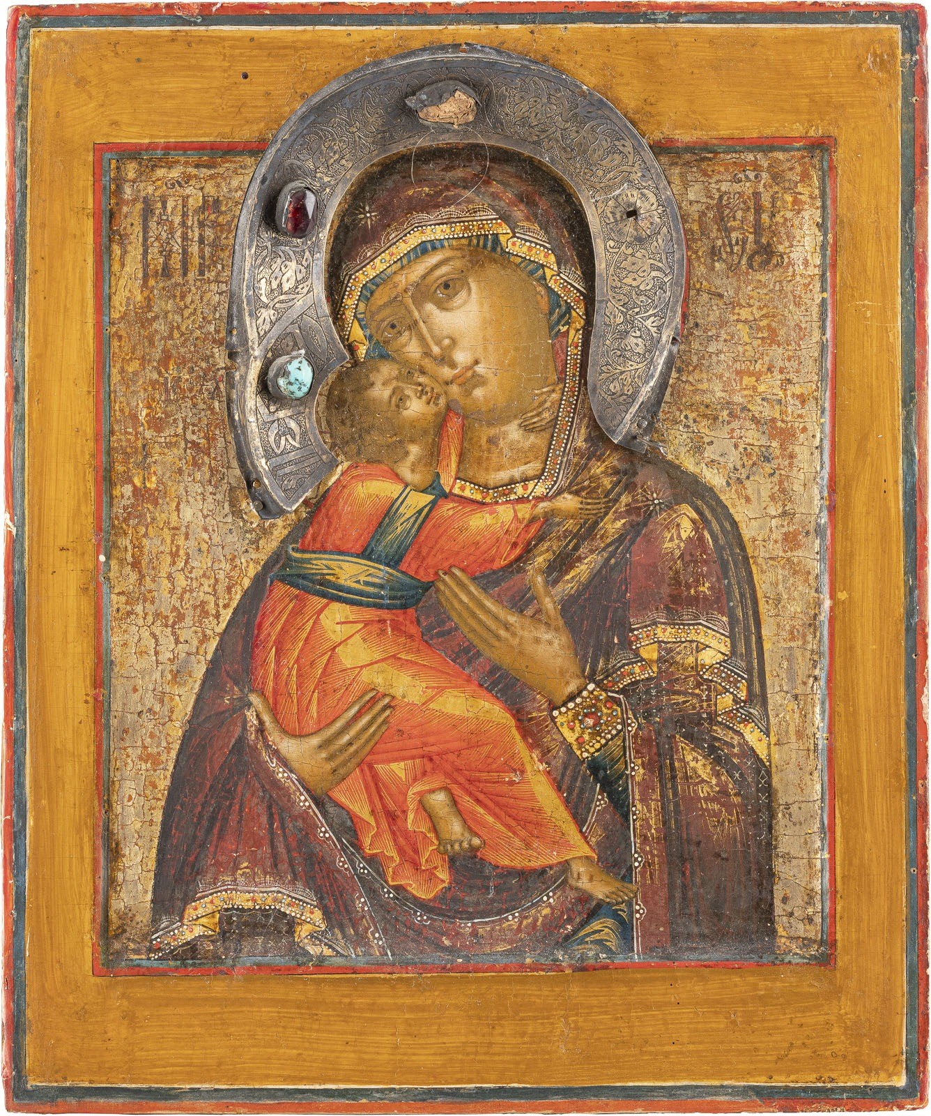 A FINE ICON SHOWING THE VLADIMIRSKAYA MOTHER OF GOD Russian, circa 1800 (icon), Russian, 17th century (haloes) Tempera on wood panel with kovcheg. The background made of silver, covered by a golden lacquer. The silver-gilt haloes set with paste. Minor areas of retouching. 30.2 x 25.3 cm.