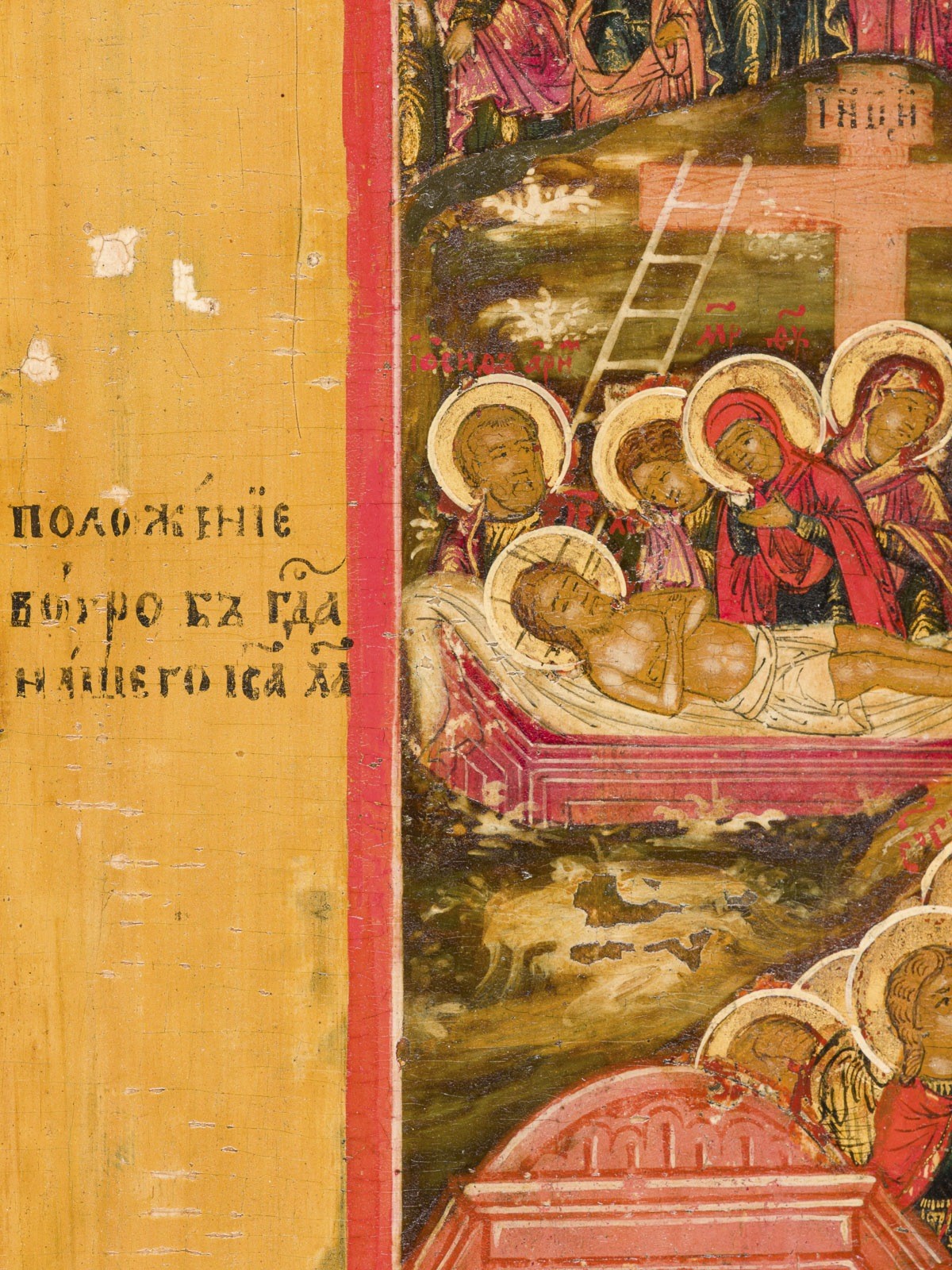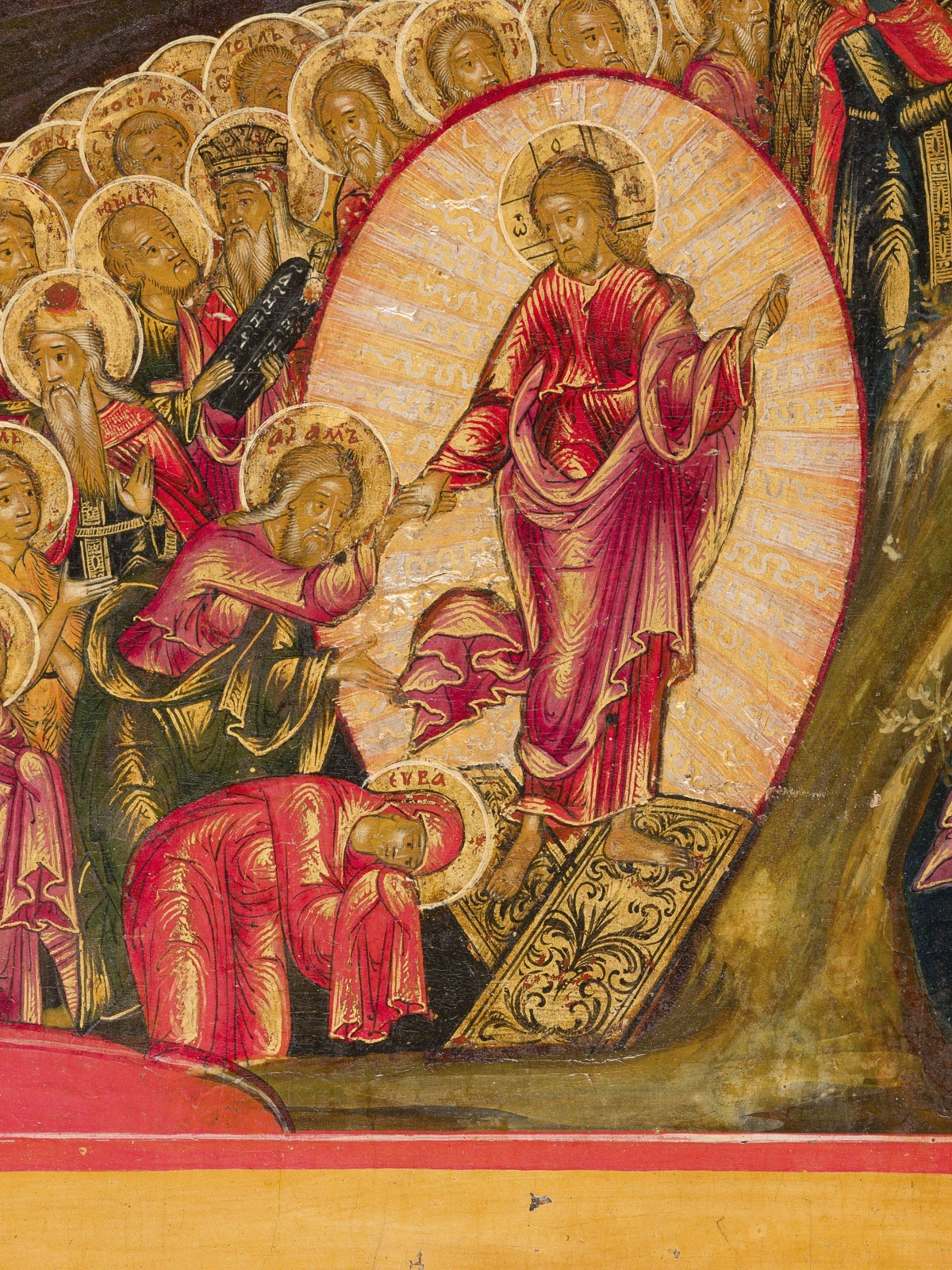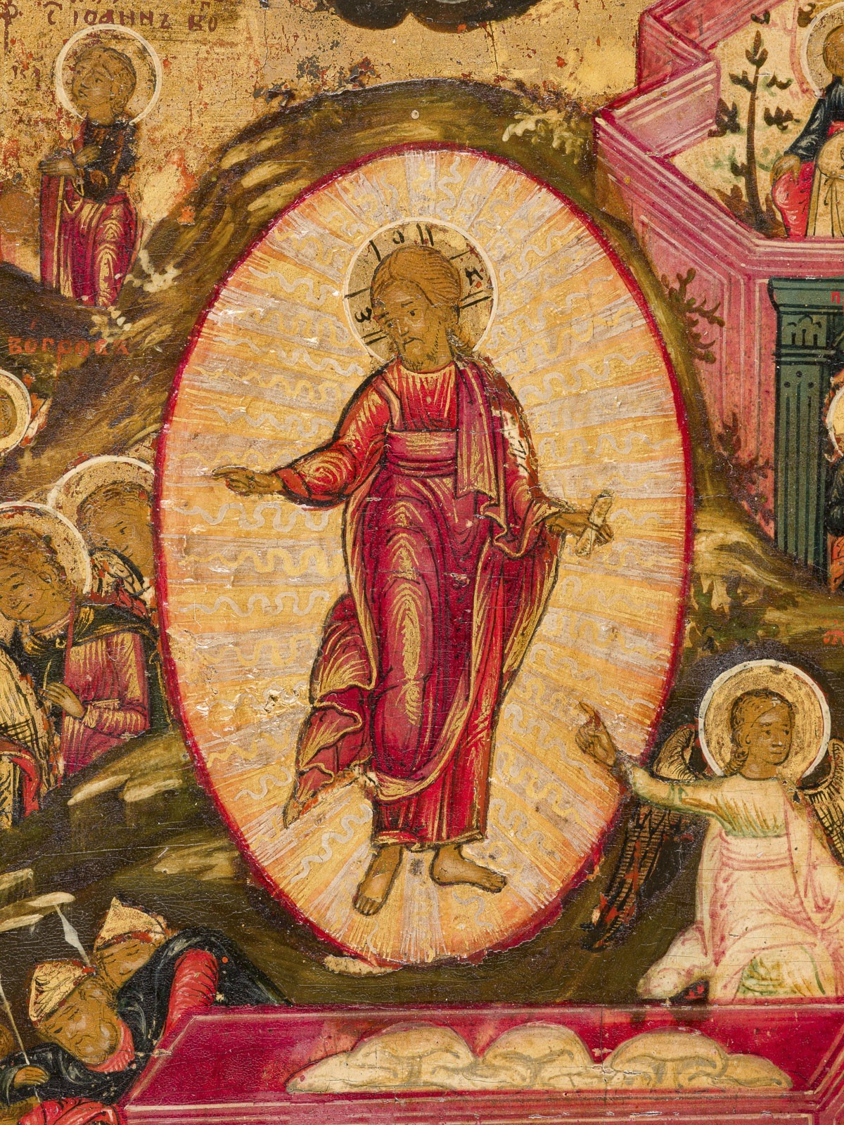 A FINE ICON SHOWING THE RESURRECTION OF CHRIST AND THE DESCENT INTO HELL Russian, circa 1800 Tempera on wood panel. The haloes made of gold. The garment folds emphasised with strong gold striations. 34.7 x 29.7 cm.