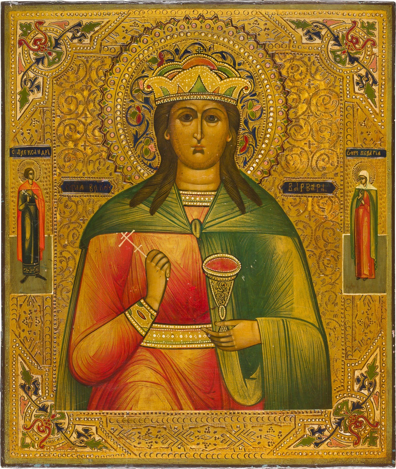 A FINE ICON SHOWING ST. BARBARA Russian, circa 1880 Tempera on wood panel. The gilt background ornately incised. The borders ornately incised and painted in faux enameling. Two selected saints on the borders: Alexander and Pelagia. 31 x 26.3 cm.