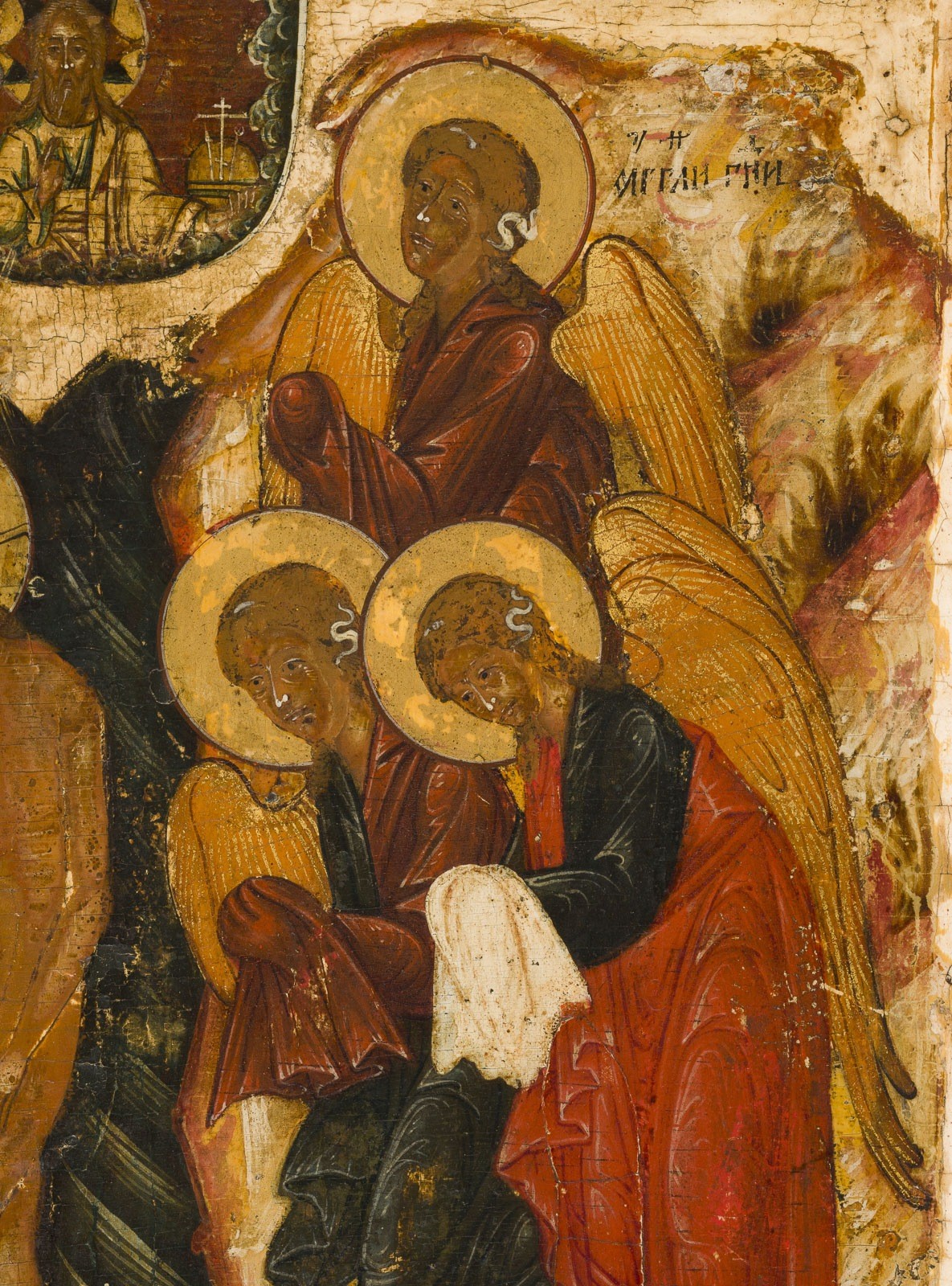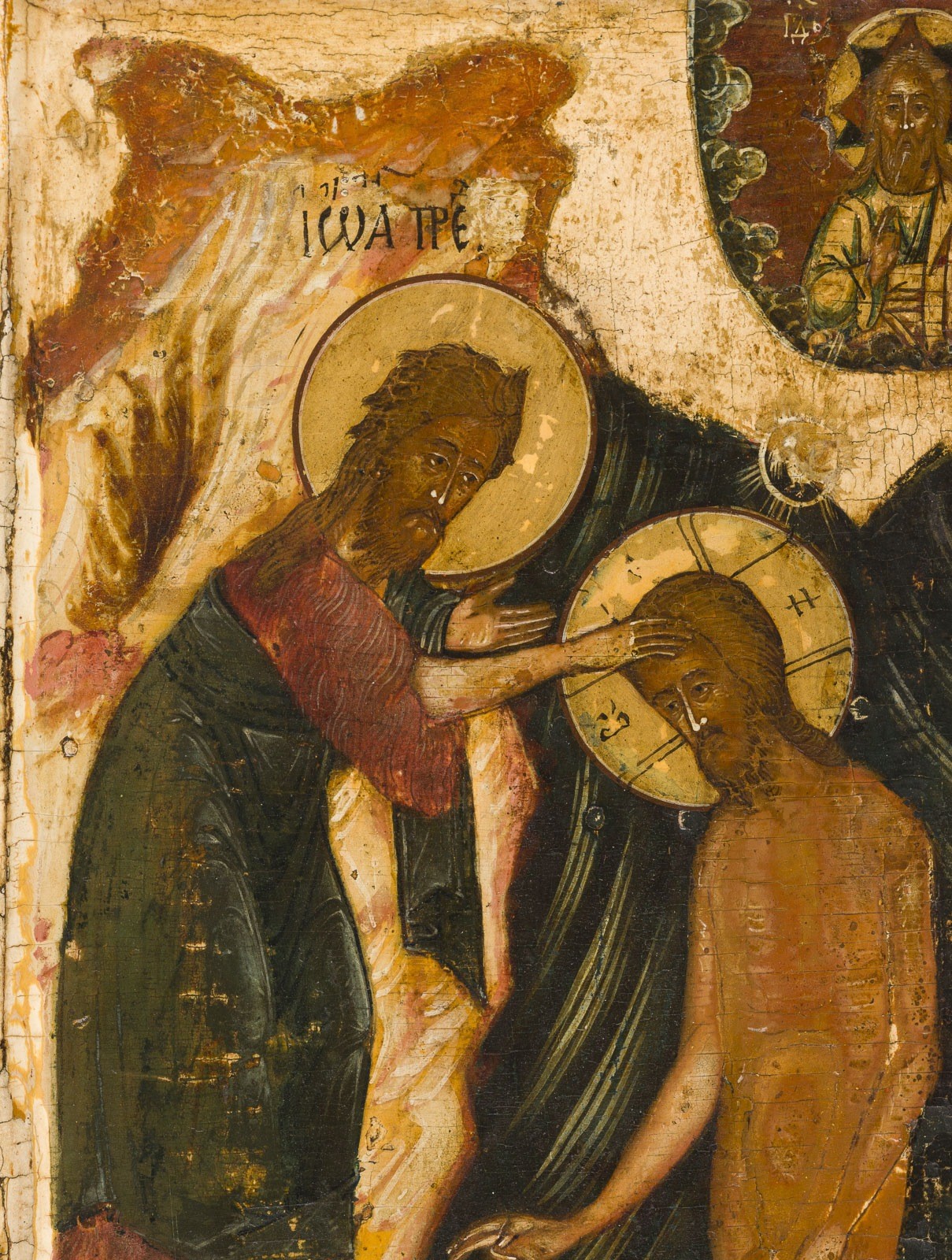 A FINE ICON SHOWING THE BAPTISM OF CHRIST Russian, 1st half of the 17th century Tempera on wood panel with kovcheg. The haloes made of gold. The brown wings accentuated with gold striations. The background and border stripped to gesso, minimally restored. 30.6 x 27 cm.