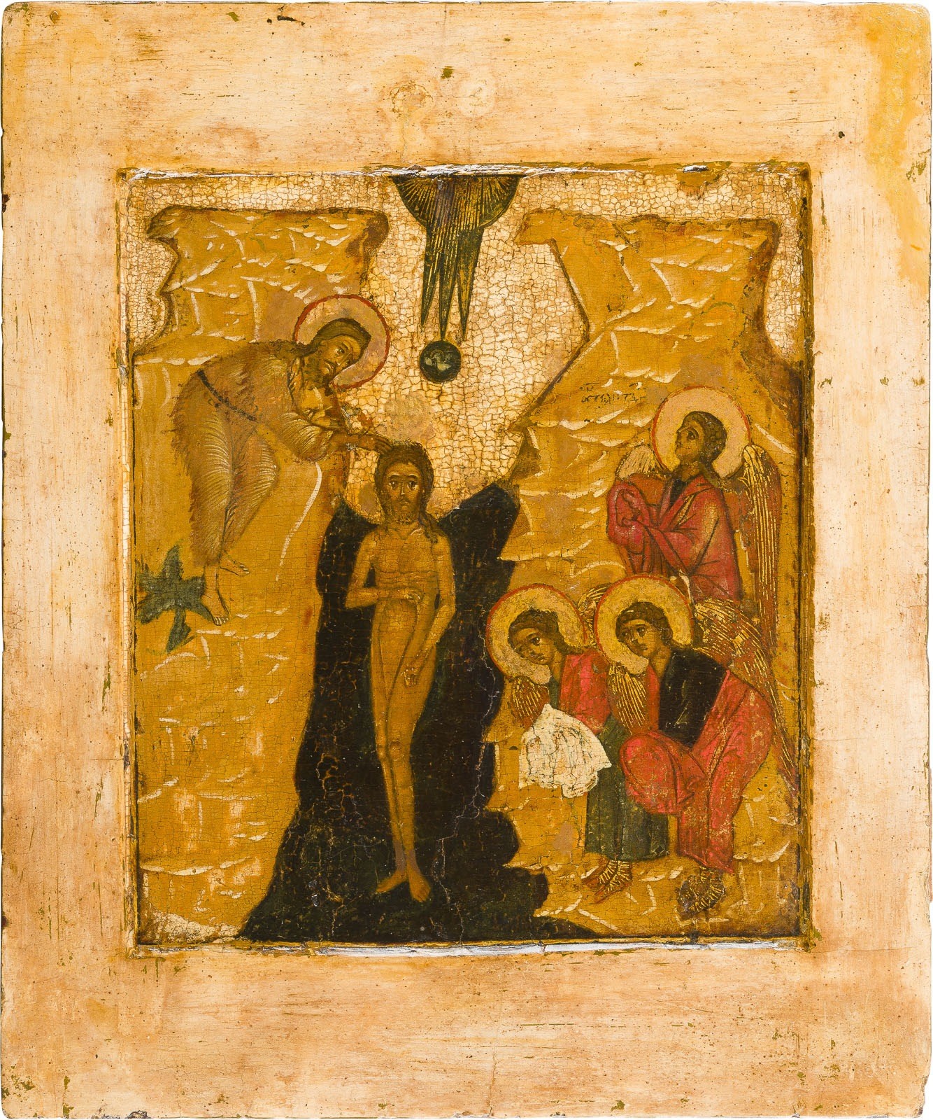 A FINE ICON SHOWING THE BAPTISM OF CHRIST Russian, 17th century Tempera on wood panel with kovcheg. The haloes and wings of the angels made of gold. The background and border stripped to gesso, partially restored. 30.9 x 25.7 cm.