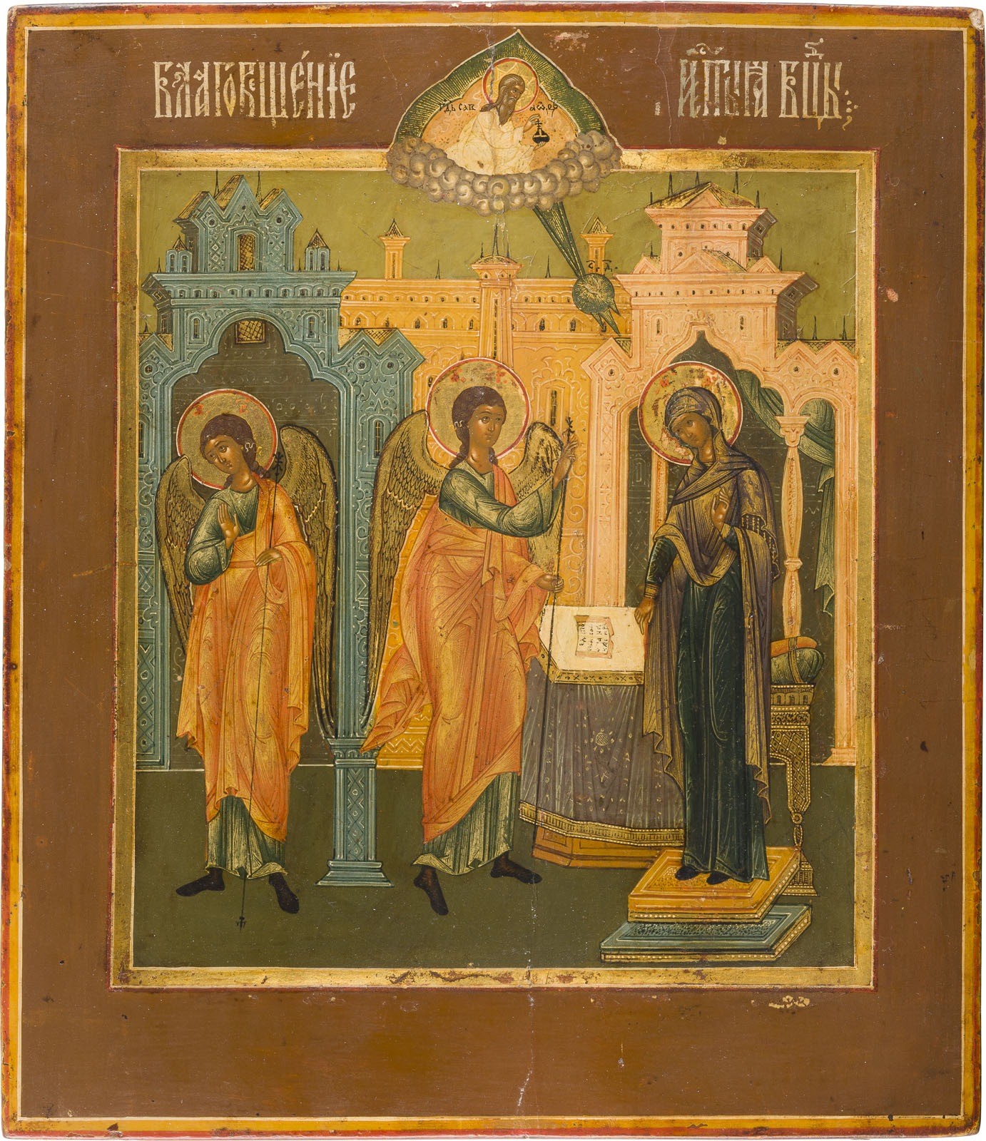 A FINE ICON SHOWING THE ANNUNCIATION OF THE MOTHER OF GOD Russian, Mstera, late 19th century Tempera on wood panel with kovcheg. The haloes, wings and borders made of gold. Their garments rendered in bright colours, highlighted with dense chrysography, Vertical cracks restored. 30.8 x 26.7 cm.