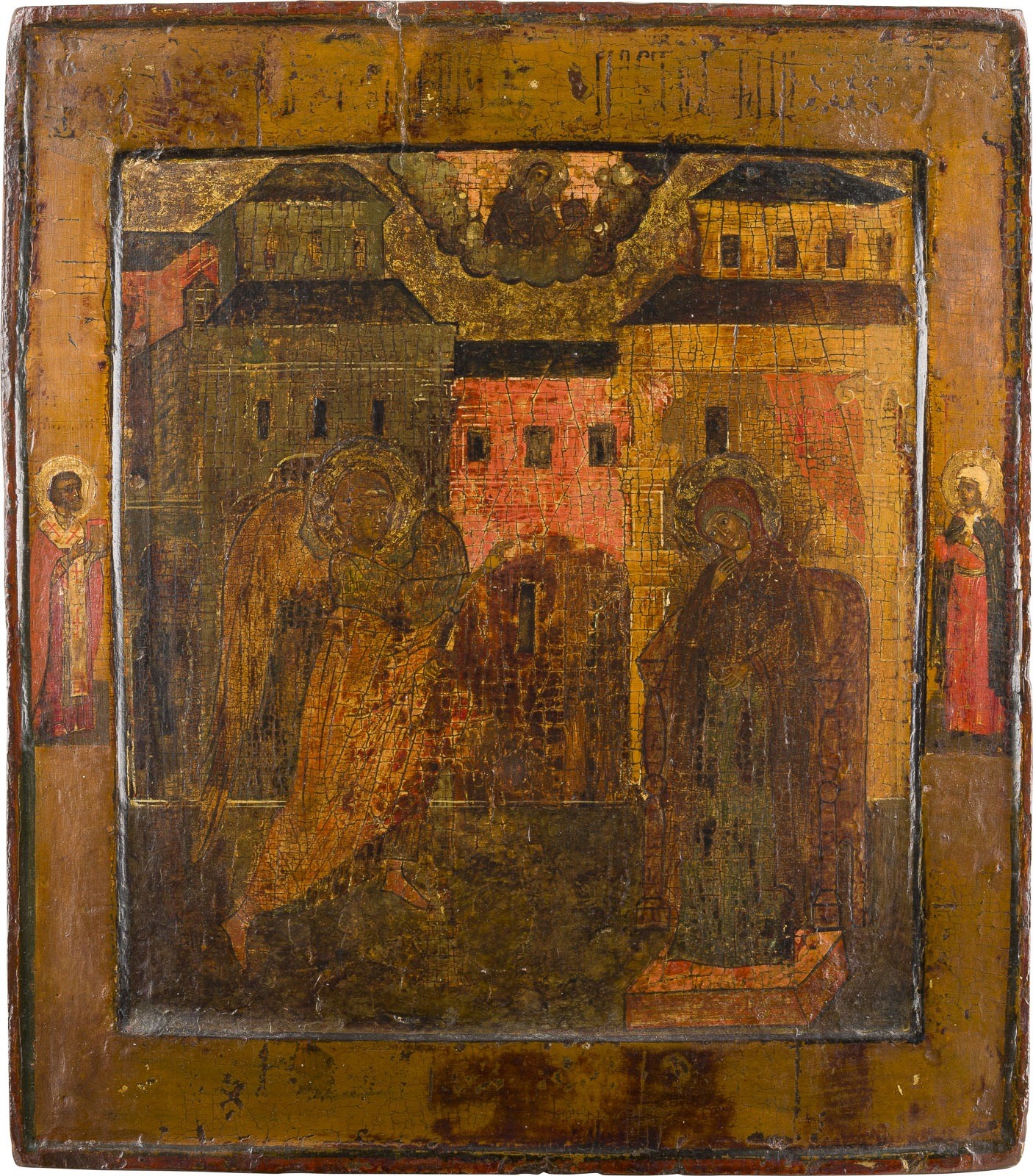 A FINE ICON SHOWING THE ANNUNCIATION Russian, 17th century Tempera on wood panel with double kovcheg. The haloes and background made of gold. Two selected saints on the borders. Minor damages to the edges, partially restored. 30.6 x 27.1 cm.