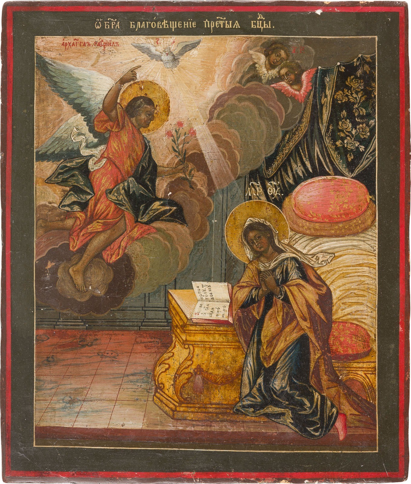 A FINE ICON SHOWING THE ANNUNCIATION Russian, mid 18th century Tempera on wood panel. The haloes and folds of the garments made of gold. Paint blisterings, partially restored. 30.9 x 26.4 cm.
