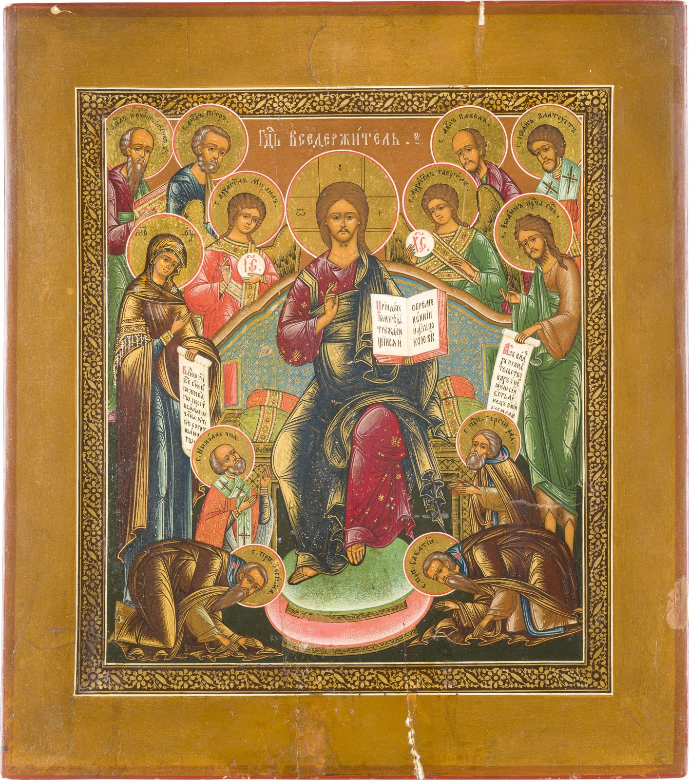 A FINE ICON SHOWING THE EXTENDED DEISIS Russian, Syzran, late 19th century Tempera on wood panel with kovcheg. The haloes made of gold. Minor vertical crack, minor areas of retouching. 35.3 x 31 cm.
