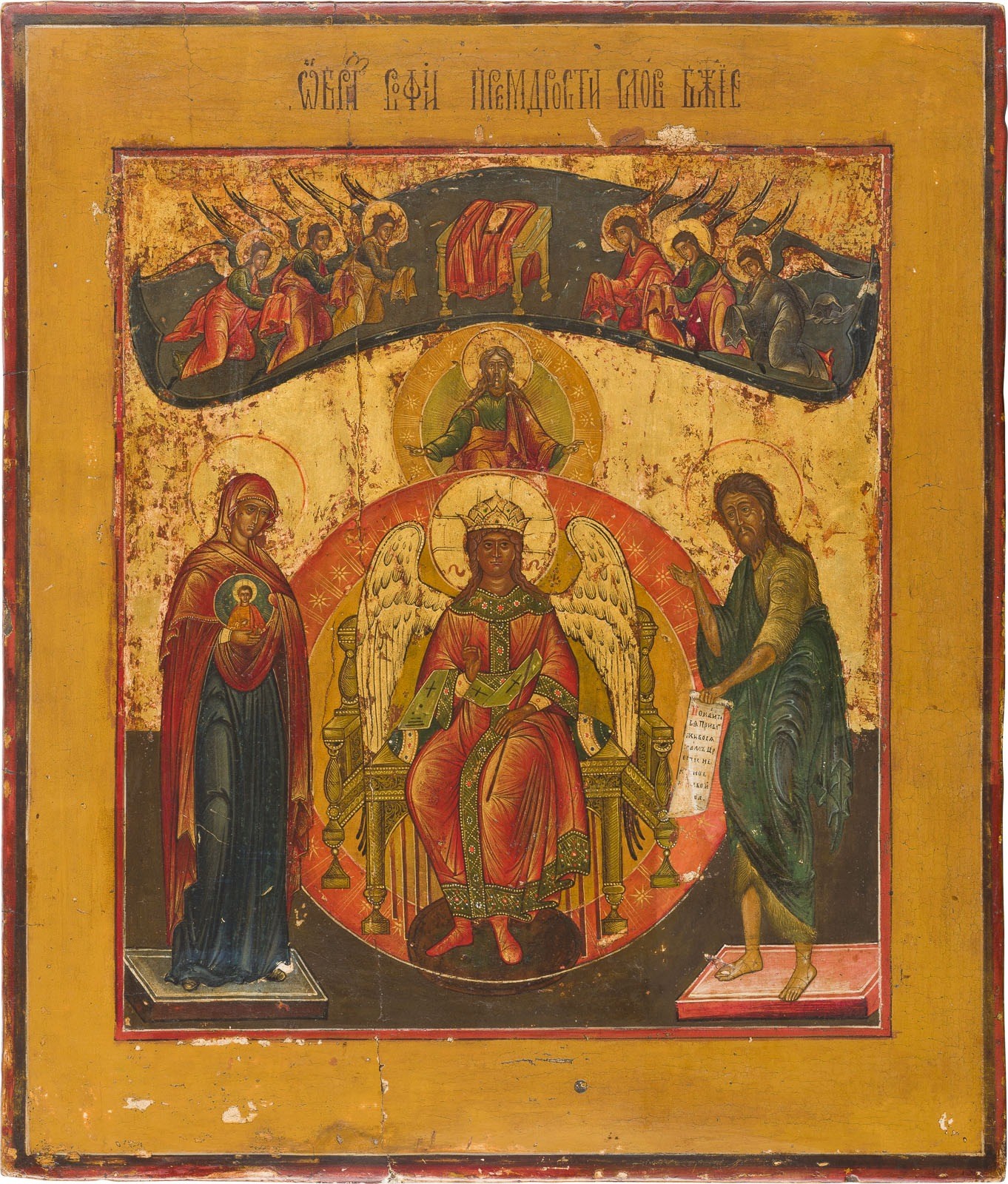 A FINE ICON SHOWING SOPHIA, THE WISDOM OF GOD Russian, 19th century Tempera on wood panel with kovcheg. The minute figures depicted in great detail with bright colours against a gold background. Minimally restored, minor losses. 35.2 x 30 cm.