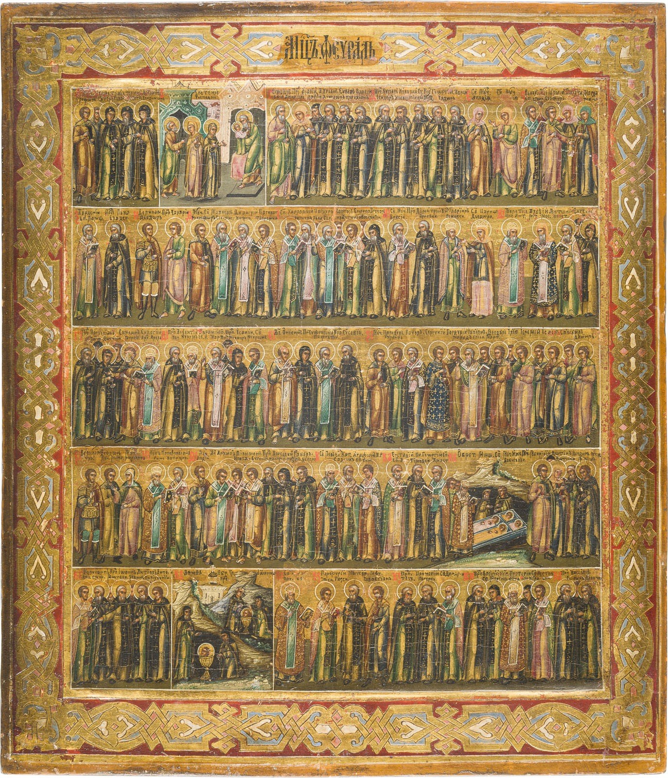 A FINE MENOLOGICAL ICON FOR THE MONTH OF FEBRUARY Russian, circa 1900 Tempera on wood panel with kovcheg. The miniature figures rendered meticulously, mostly with reds and greens against a gold background. The border decorated with engraved stylized patterns emulating the metal oklads of contemporary icons. 35 x 30.6 cm.