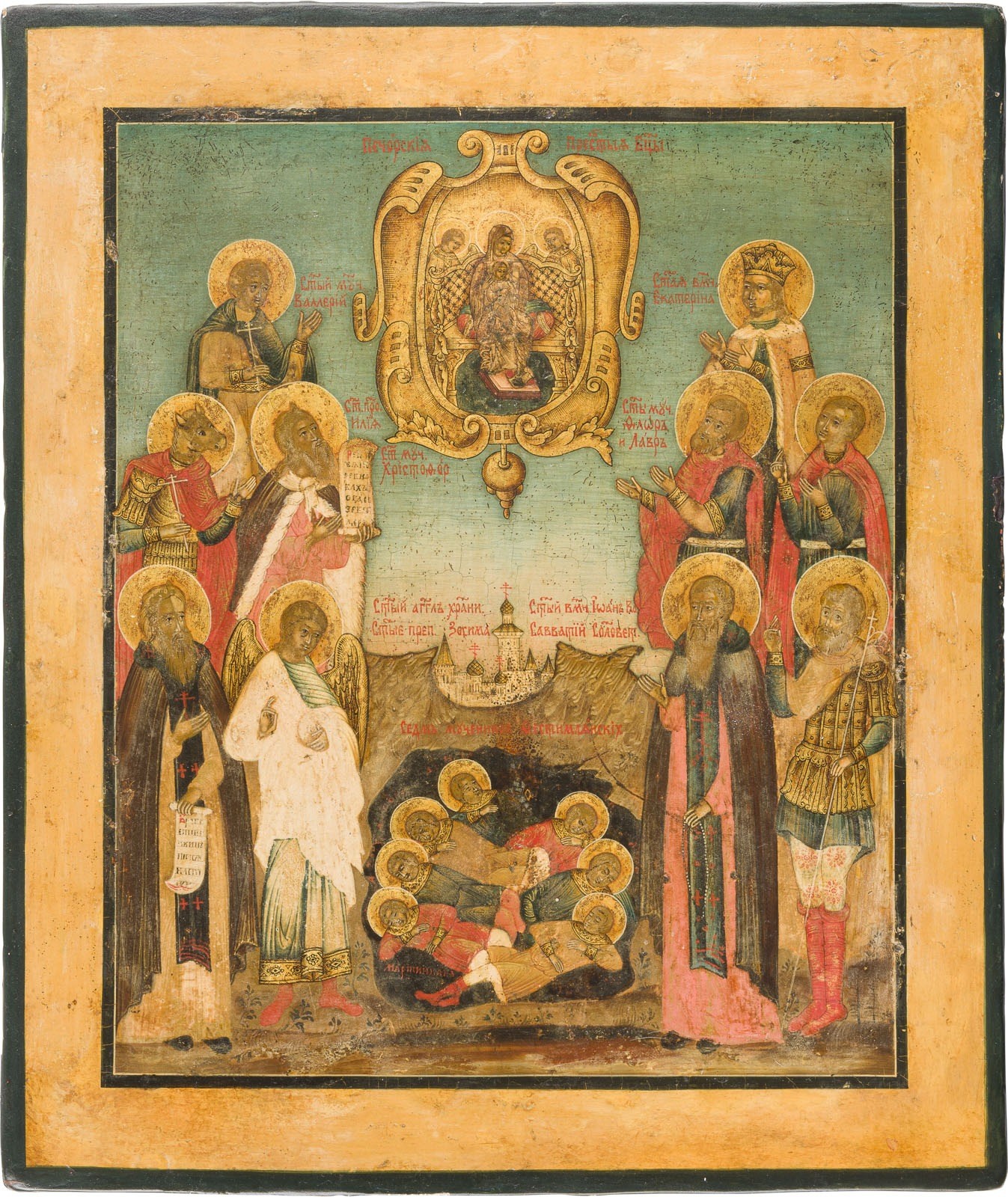 A FINE PATRONAL ICON SHOWING THE ENTHRONED MOTHER OF GOD AND A SELECTION OF FAMILY SAINTS Russian, 18th century Tempera on wood panel. The haloes made of gold. Finely painted in great detail. Among the saints the Seven Sleepers of Ephesos and the dog-headed Christophorus. Minimally restored. 32.3 x 27.4 cm.