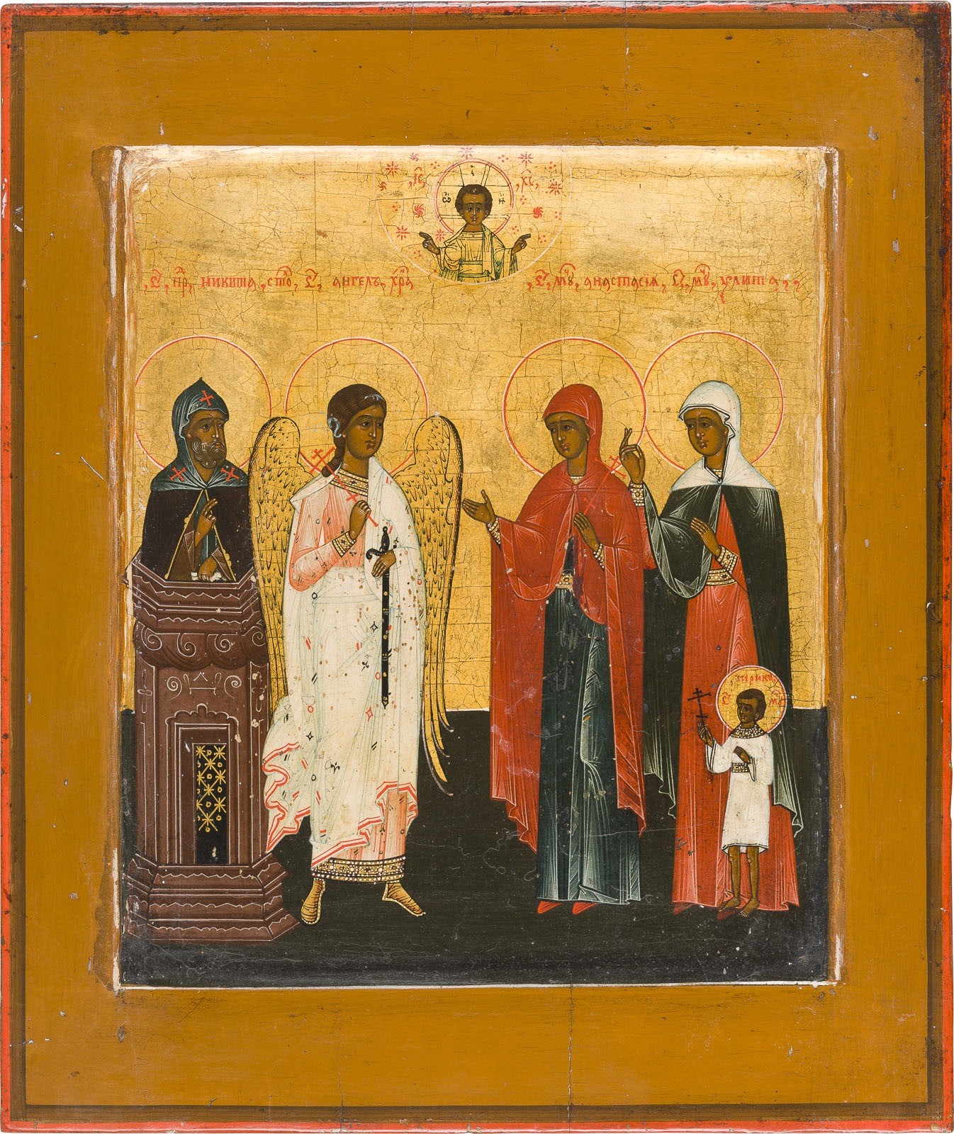 FINE PATRONAL ICON WITH A STYLITE SAINT, THE GUARDIAN ANGEL, AND SAINTS ANASTASIA, JULITTA AND QUIRIACUS Probably Raja (present-day Estonia), probably the workshop of Frolov, circa 1900 Tempera on wood panel with kovcheg, finely painted in bright colours against a gold ground. Minor retouching. 30.8 x 26.1 cm.