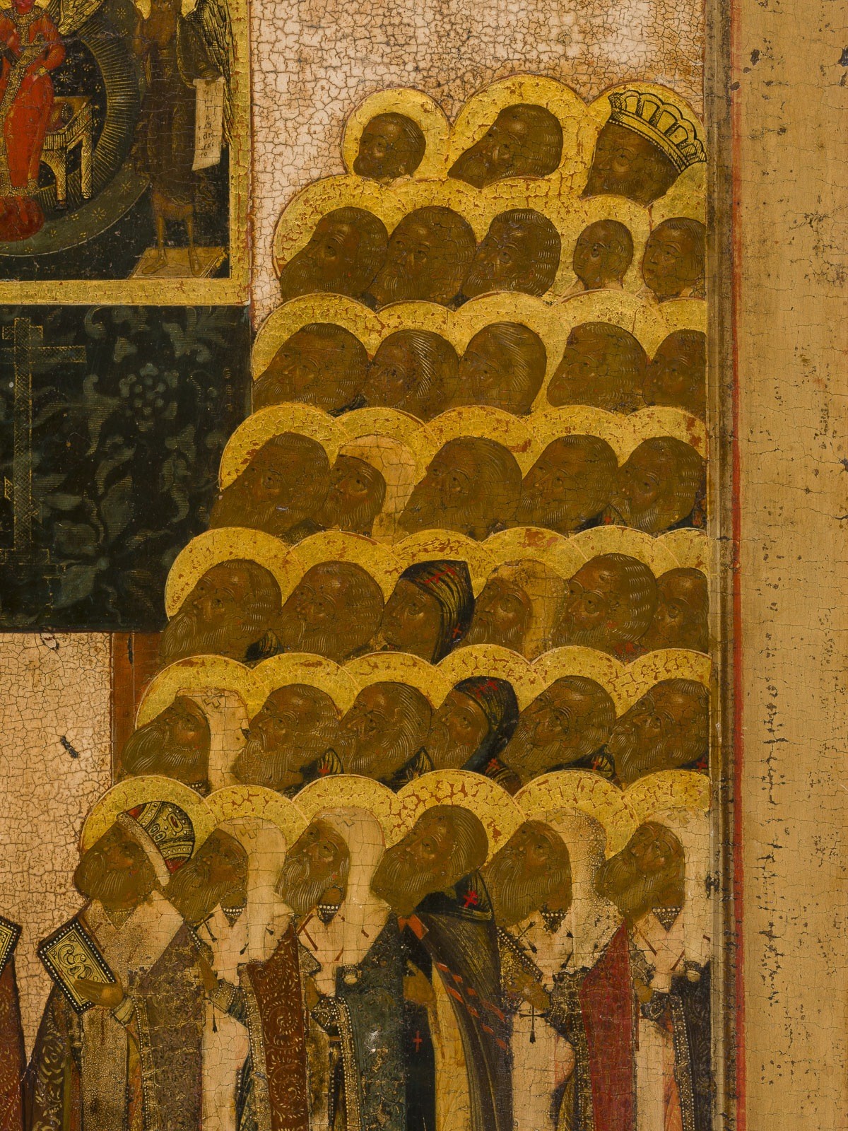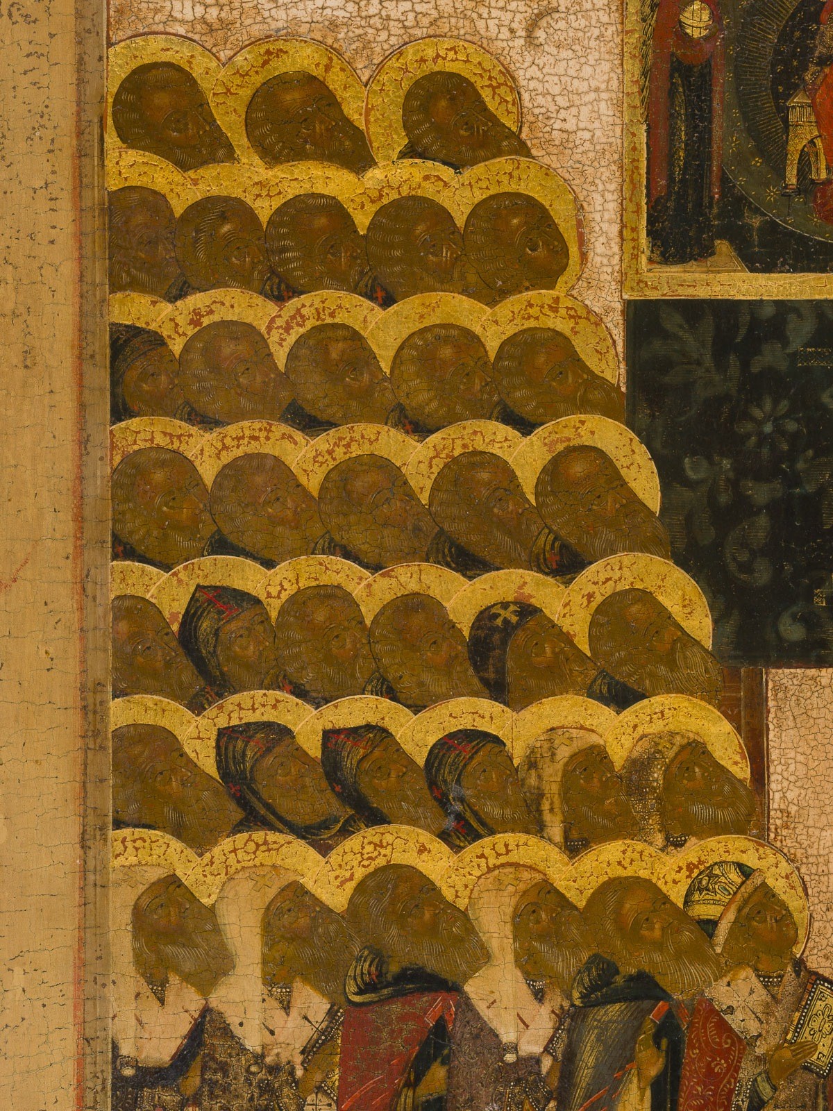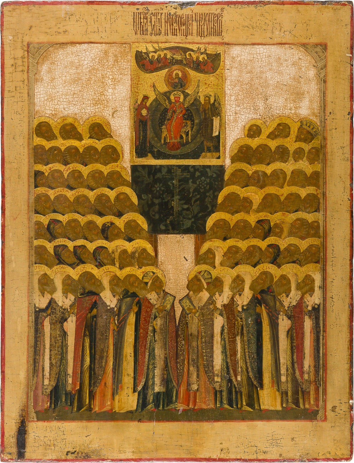 A FINE AND LARGE ICON OF 'ALL SAINTS, MIRACLE-WORKERS OF NOVGOROD' Russian, 18th century Tempera on wood panel, gesso, and gilding. The garments are ornamented with great care, showing folds and vegetal motifs. Very fine modeling of the flesh tones. The background stripped to the gesso, lower border partly restored. 54 × 42 cm.