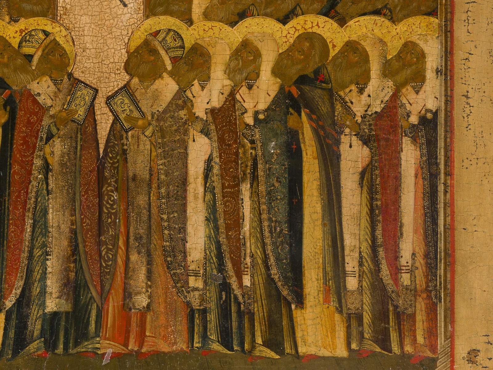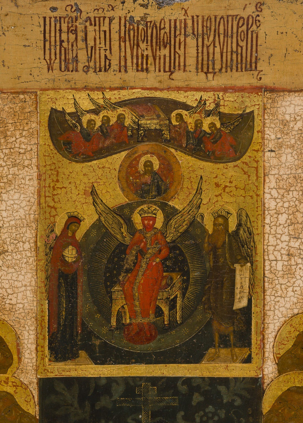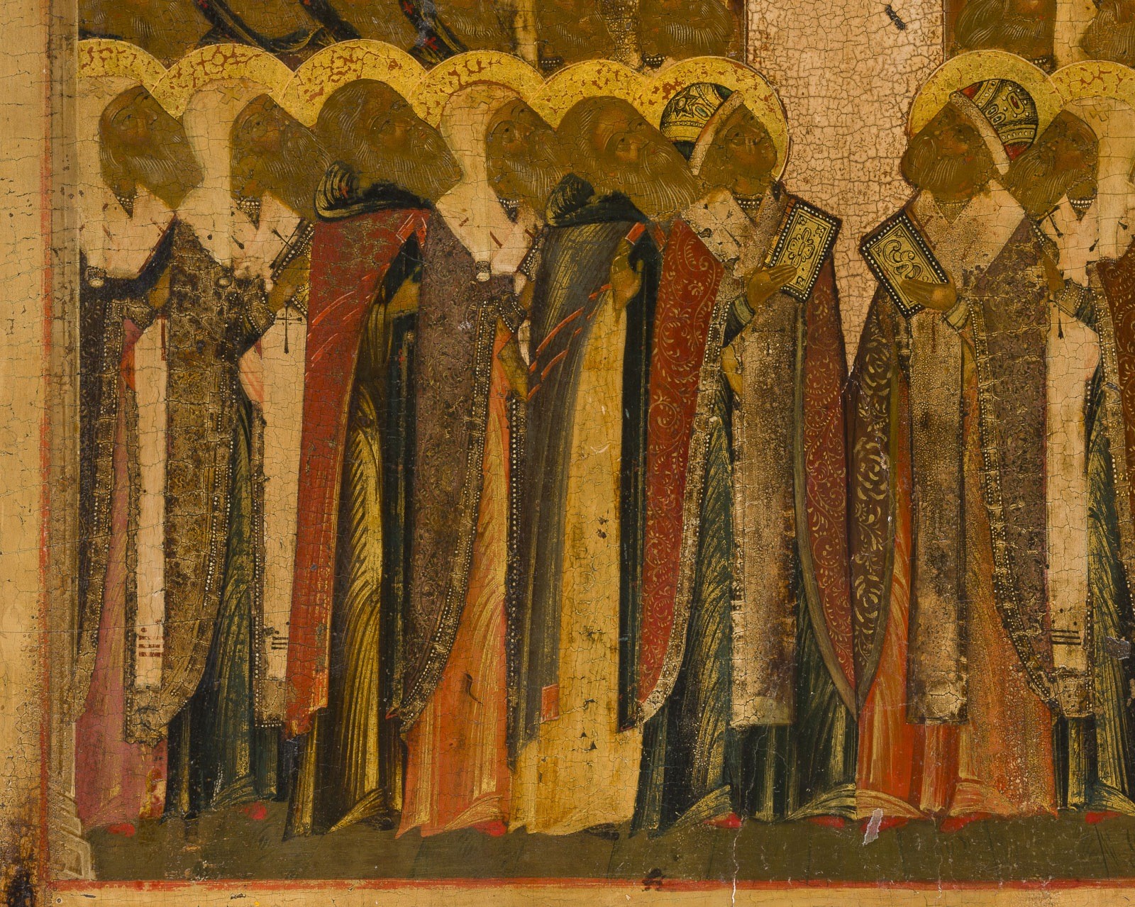 A FINE AND LARGE ICON OF 'ALL SAINTS, MIRACLE-WORKERS OF NOVGOROD' Russian, 18th century Tempera on wood panel, gesso, and gilding. The garments are ornamented with great care, showing folds and vegetal motifs. Very fine modeling of the flesh tones. The background stripped to the gesso, lower border partly restored. 54 × 42 cm.
