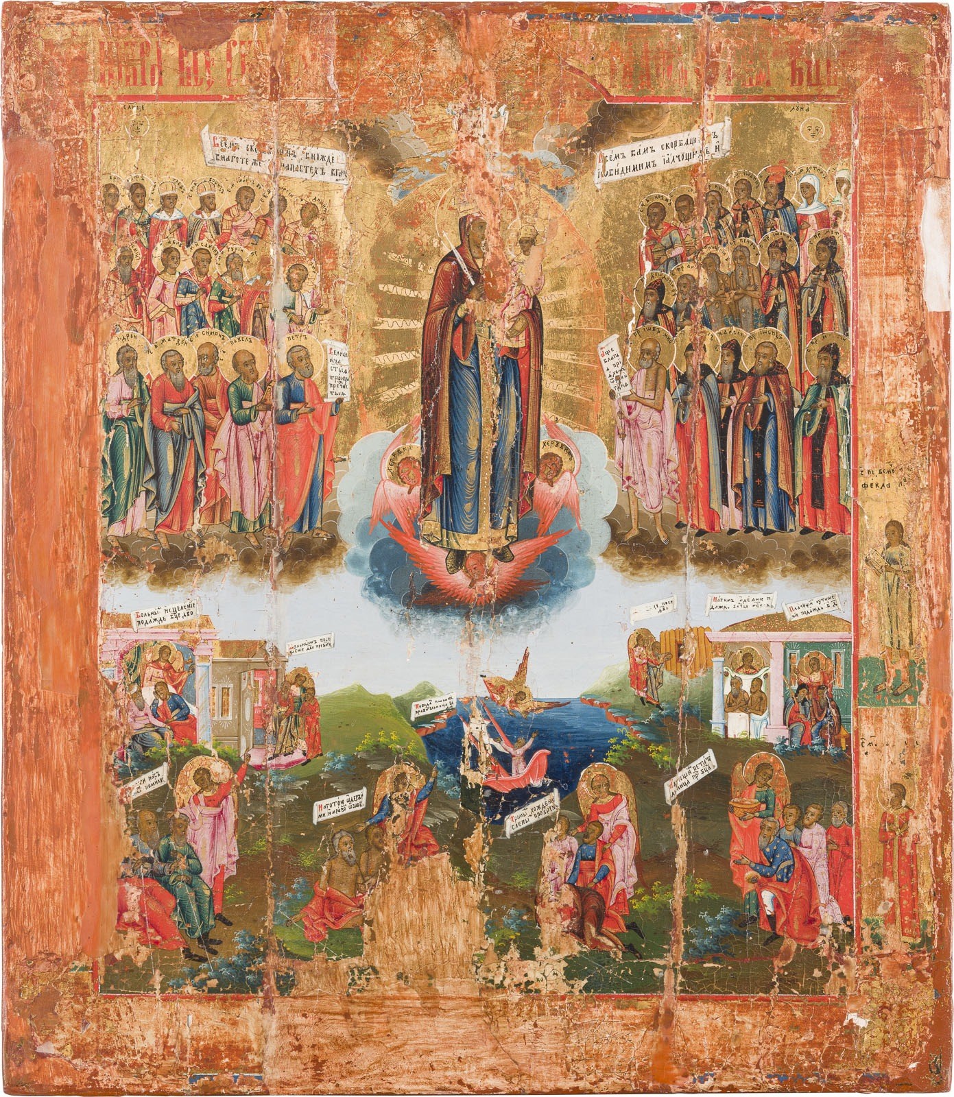 A FINE AND LARGE ICON SHOWING THE MOTHER OF GOD 'JOY TO ALL WHO GRIEVE' Russian, Vetka, 19th century Tempera on wood panel. Finely painted in bright colours against a golden background. Losses, paint blisterings. 39.8 x 34.8 cm.