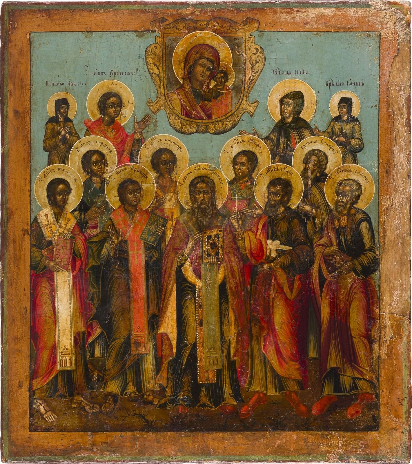 A FINE AND LARGE ICON SHOWING THE KAZANSKAYA MOTHER OF GOD AND 13 SELECTED SAINTS Russian, 1st half of the 18th century Tempera on wood panel. The haloes made of gold. Finely painted, the faces in soft, earthen tones, the garments' folds highlighted in gold. Losses to the borders, restorations. 44.6 x 39.8 cm.