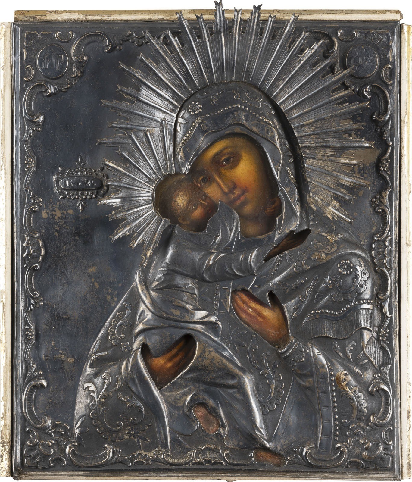 A FINE AND LARGE ICON SHOWING THE VLADIMISKAYA MOTHER OF GOD WITH SILVER OKLAD Russian, mid-19th century (icon), Odessa, 1853 (oklad) Oil on wood panel with velvet backing. The silver oklad decorated with rich, embossed rocaille patterns. Marked with city hallmark, assayer's mark and 84 standard. Partially restored. 35 x 29.2 cm (without frame).