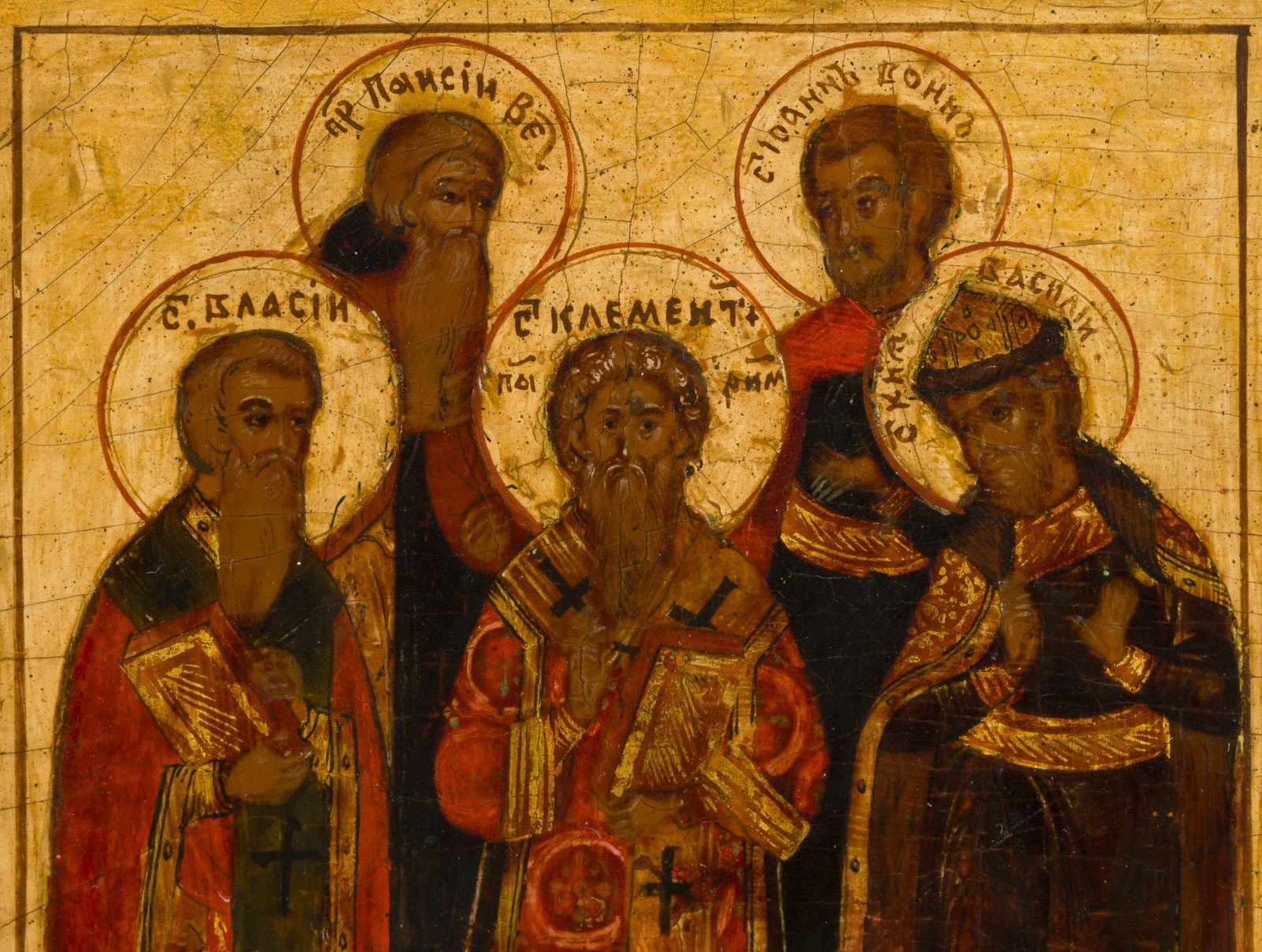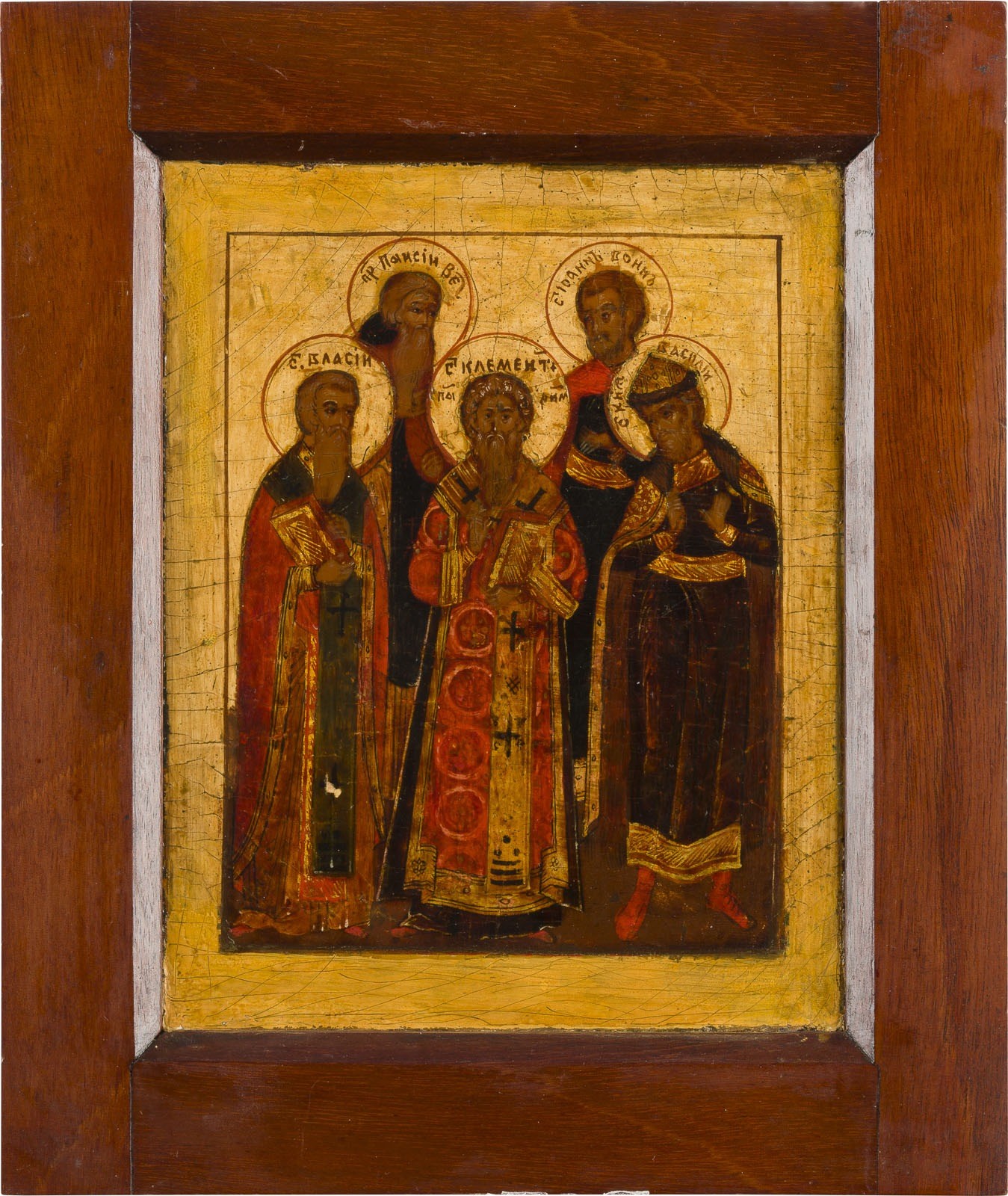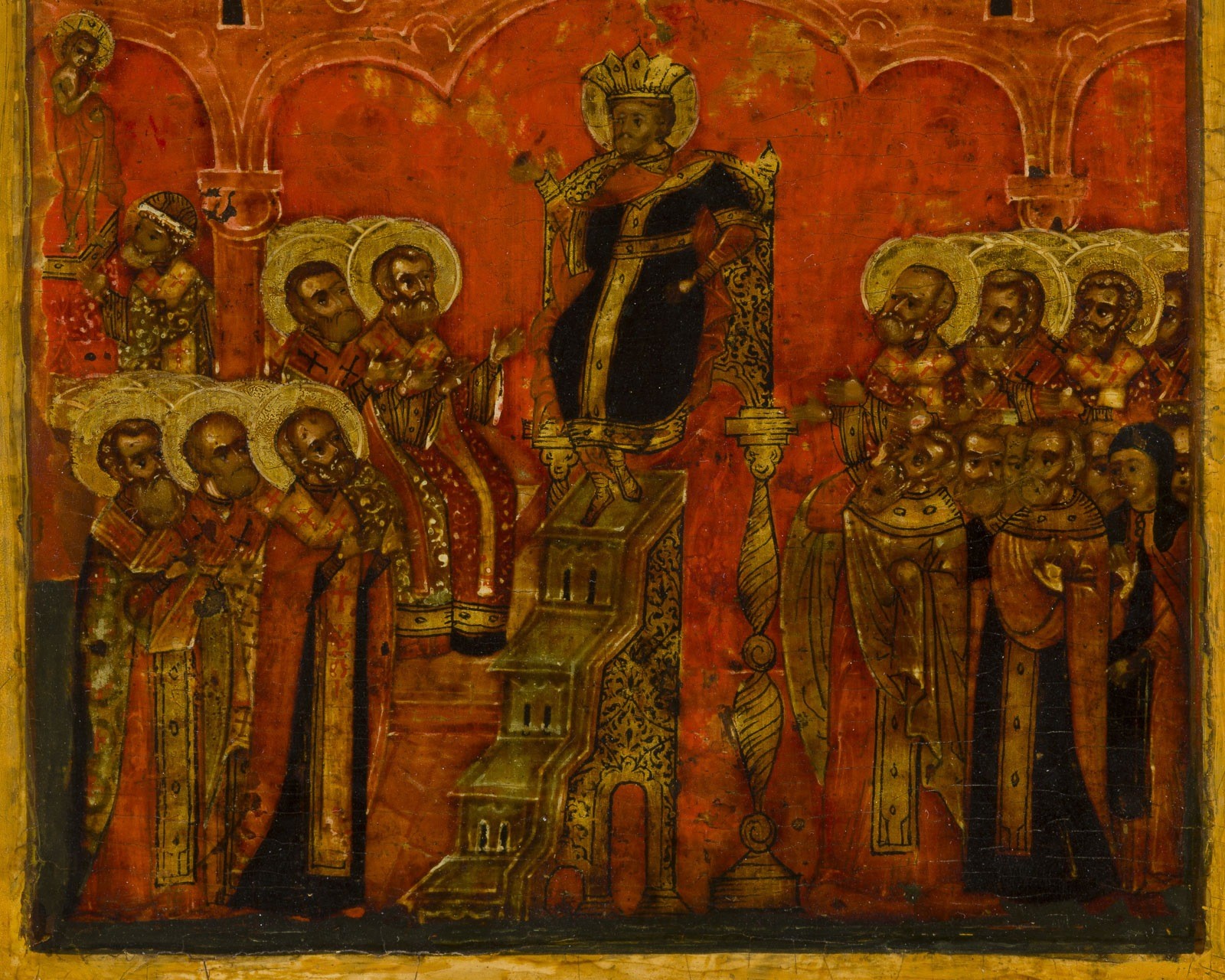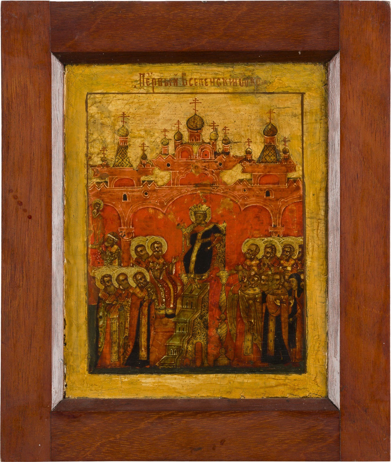 A FINE DOUBLE-SIDED TABLETKA SHOWING THE FIRST COUNCIL OF NICAEA AND FIVE SELECTED SAINTS Russian, 17th century Finely painted in great detail, the haloes made of gold. The Emperor Constantine, at the centre of the composition, is surrounded by groups of bishops, (Orthodox on the left and heterodox on the right), which includes Saints Nicholas, Basil and Athanasius, he is shown again below, conversing with the bishops, in the lower-right corner Arius, with his entrails spilling out, is depicted in the public lavatory where he died, in the lower left corner, is depicted the vision of Saint Peter, Bishop of Alexandria. On the reverse side, a full-figure depiction of Sts. Blaise, Paisius, Clement, John the Warrior, and Basil is shown. The background and border stripped to gesso, minimally restored. 23.5 x 19.8 cm (with later frame).