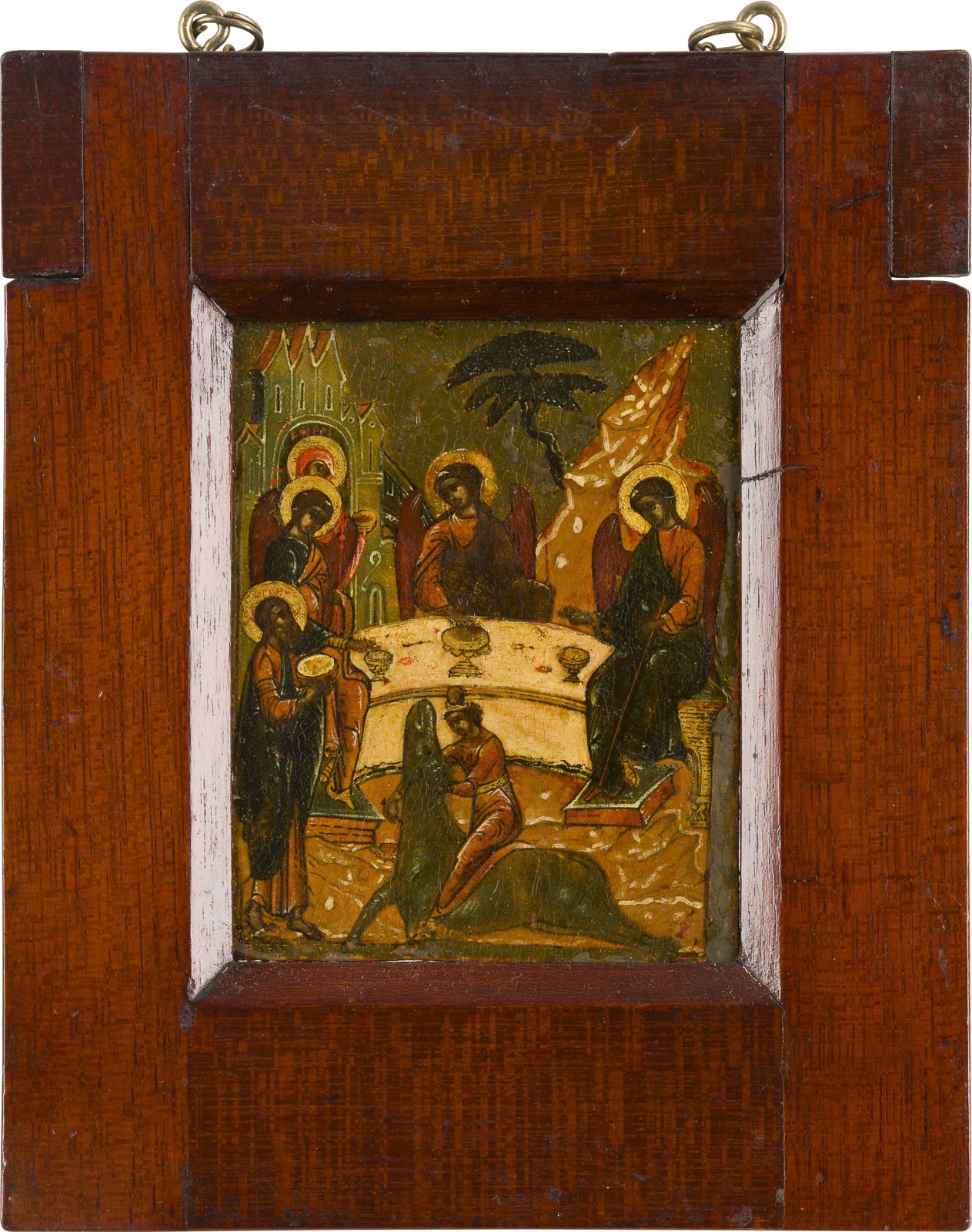 A FINE DOUBLE-SIDED TABLETKA SHOWING THE OLD TESTAMENT TRINITY AND THE PENTECOST Russian, 16th century Finely painted in great detail, the haloes made of gold. Finely painted in bright colours against an architectural background. Minor areas of retouching. 14.8 x 12.2 cm (with later frame).