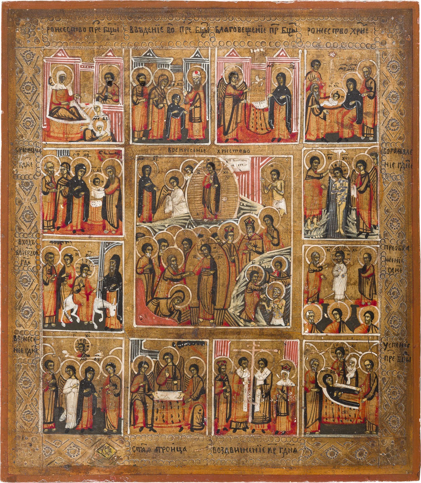 AN ICON SHOWING THE RESURRECTION AND DESCENT INTO HELL SURROUNDED BY TWELVE MAJOR FEASTS OF THE CHURCH Russian, late 19th century Tempera on wood panel. The background made of silver, covered by a golden lacquer. The border incised to resemble a chased gilded silver oklad. Minor losses. 35.4 x 30.8 cm.
