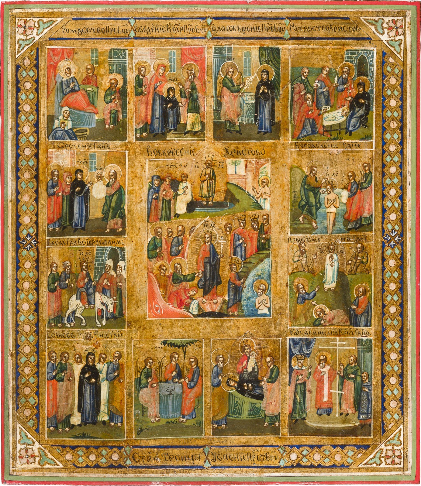 A FESTIVAL ICON Russian, late 19th century Tempera on wood panel. The background made of silver, covered by a golden lacquer. The borders ornately incised and painted in faux enameling. Minimally restored. 35.1 x 30.4 cm.