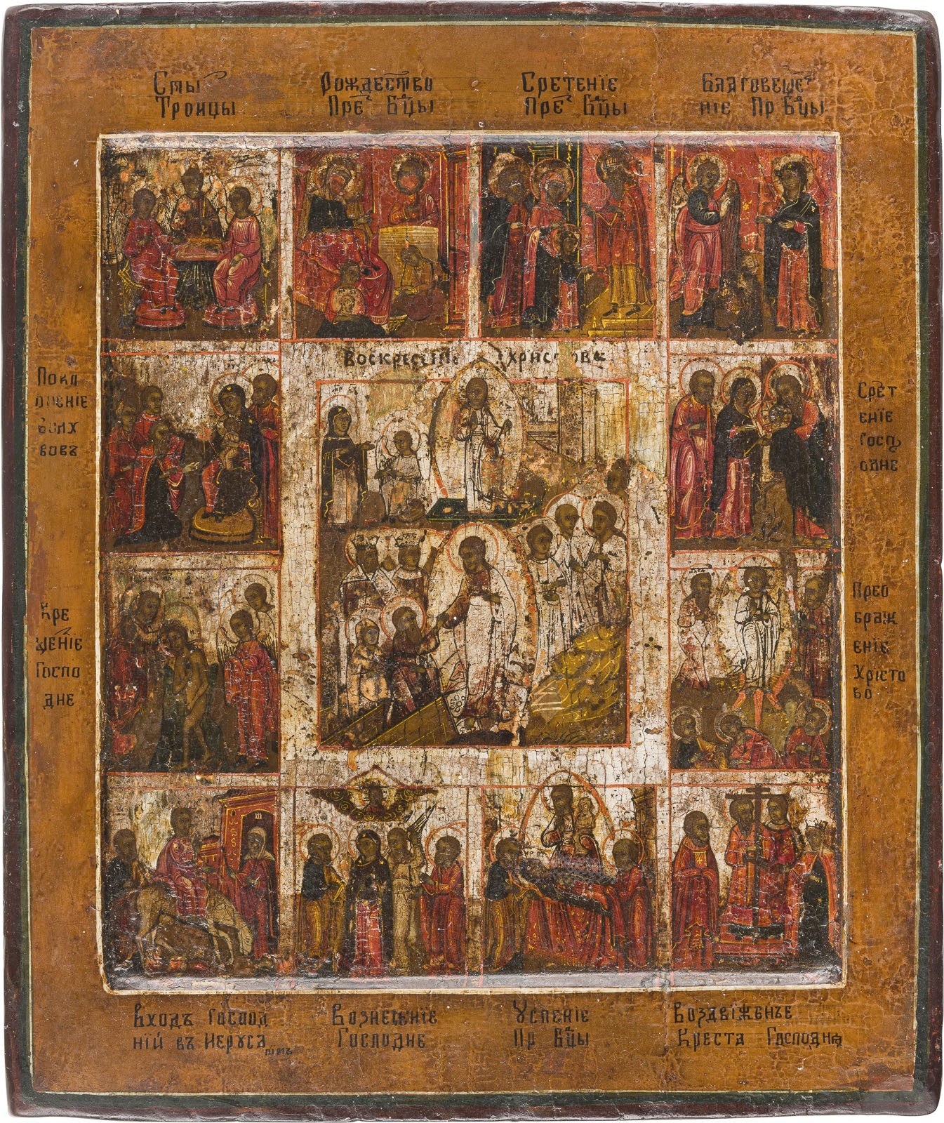 A FEAST DAY ICON Russian, 18th century Tempera on wood panel with kovcheg. The background made of silver, covered by a golden lacquer. Restorations. 31.9 x 27 cm.