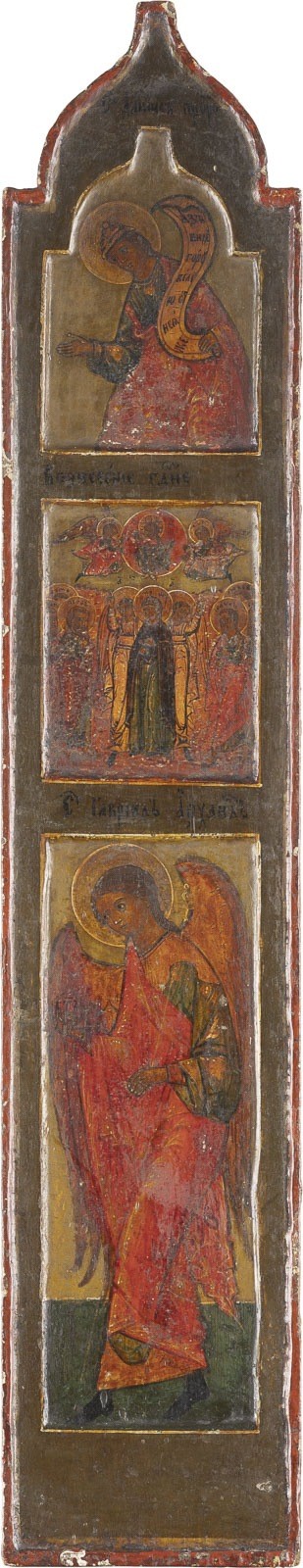 A WING OF A TRAVELLING ICONOSTASIS SHOWING THE ASCENSION OF CHRIST, A PROPHET AND THE ARCHANGEL GABRIEL Russian, 19th century Tempera on wood panel with kovcheg. Minor losses, minimally restored. 52.5 x 10 cm.