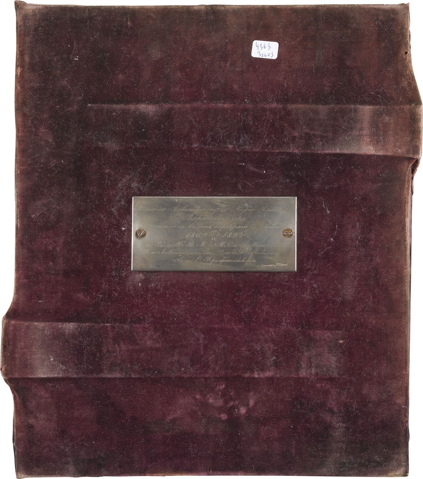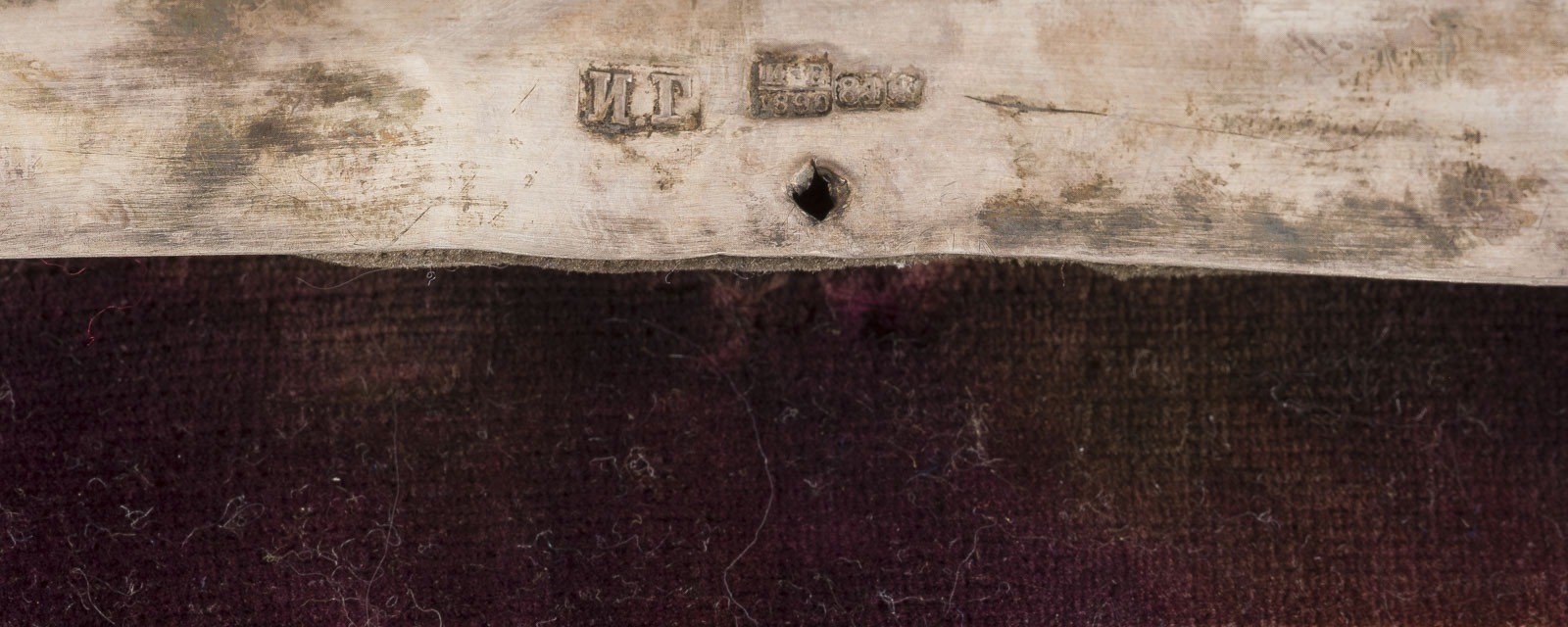 A PRESENTED GIFT TO AN OFFICIAL OF THE RUSSIAN MINISTRY OF THE INTERIOR: AN ICON OF THE VLADIMIRSKAYA MOTHER OF GOD WITH SILVER OKLAD Russian, 19th century (icon), St. Petersburg, 1890 (oklad), St. Petersburg, Morozov, late 19th century (plaque) Tempera on wood panel with kovcheg, the haloes gilded, verso with velvet backing. Silver oklad with finely repoussé decoration. Struck with city hallmark, assayer's mark, 84 standard, and master's marks 'I.G.' and 'MOROZOV' in Cyrillic. The reverse with a silver placque with Cyrillic dedicatory inscription: To Grigorii Alexandrovich Kozin in commemoration of his 25 years of service in the Ministry of the Interior, 1869-1894, from P. I. Maslov, S. A. Melikov, I. I. Patrikeev, E. Osokin and other colleagues. Restored. 33.5 x 28.7 cm.