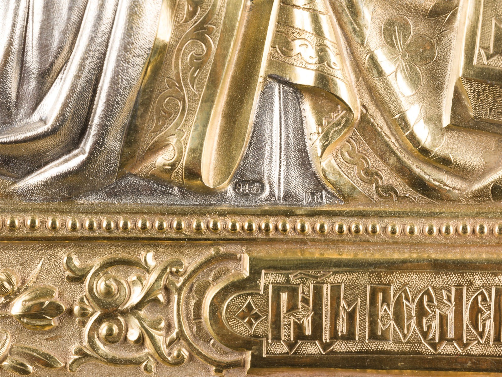 A GIFT FROM THE TVER MANUFACTURING COOPERATIVE: AN ICON OF CHRIST PANTOKRATOR WITH VERMEIL OKLAD Russian, late 19th century (icon); Russian, Moscow, Antip Kuzmichev, 1898 (oklad) Tempera on wood panel, the reverse covered with velvet. The oklad of gilded silver with finely chased relief decoration. Struck with city hallmark, 84 standard and master's mark 'A.K.' in Cyrillic. Partially restored. On the reverse, a metal plaque engraved in Cyrillic: 'For the Partnership of Mutual Aid from the founders of the Tver Manufactory, Moscow, 10 May 1889.' 31.2 x 26.7 cm. The Tver Manufactory was one of Russia's most important textile enterprises. Founded by Savva Morozov, it was divided among his brothers in 1859 and successfully continued by them. The Morozov family is also renowned as among the greatest collectors of French Impressionism.