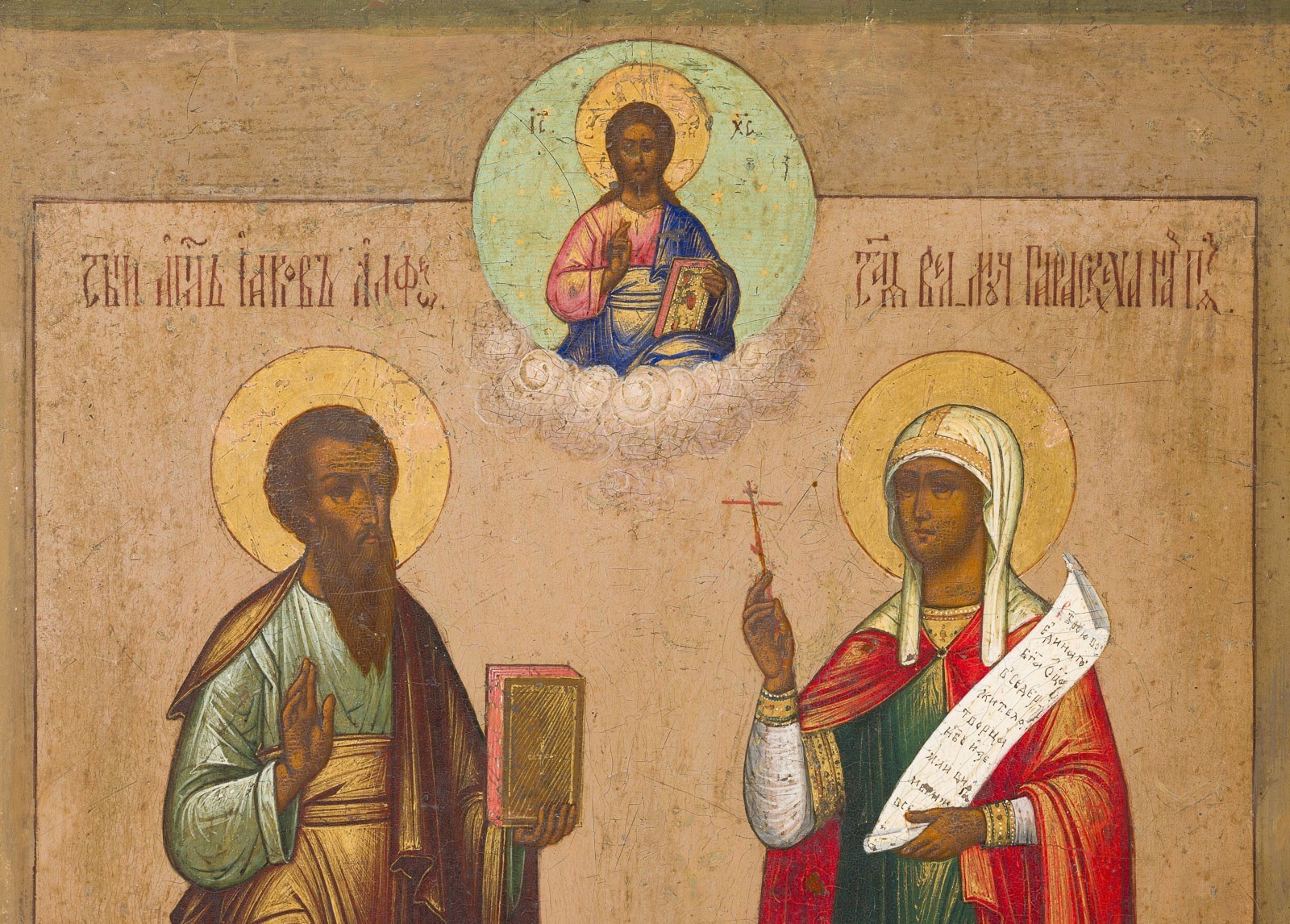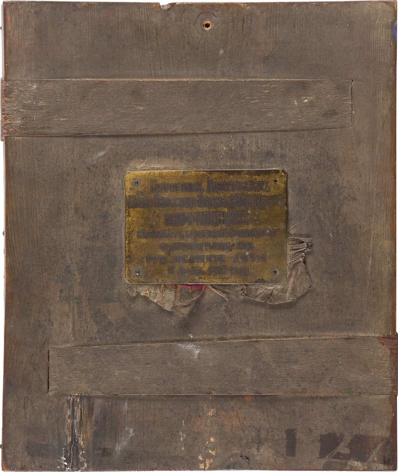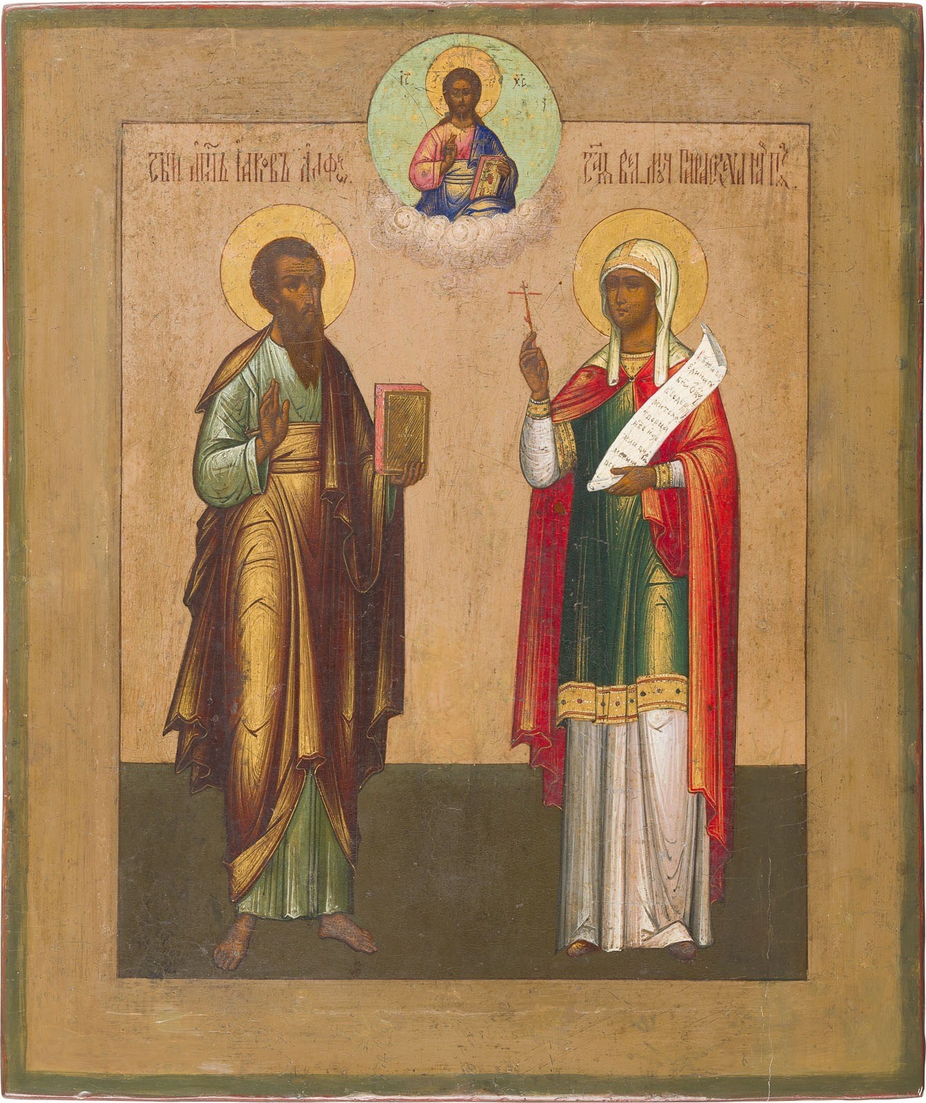 GIFT FOR THE 40TH WEDDING ANNIVERSARY: A FINE ICON WITH THE APOSTLE JAMES AND SAINT PARASKEVA Russian, dated 1887 Tempera on wood panel. The haloes made of gold. The folds of the garments are rendered in gold. On the reverse, a mounted metal plaque with a Cyrillic dedicatory inscription: 'To our dear parents Yakov Ivanovich and Paraskeva Mikhailovna Panfilov on their 40th wedding anniversary, from their beloved children. 11 July 1887.' Partially restored. 31.2 x 26.3 cm. J. I. Panfilov was a merchant from Yekaterinburg (d. after 1889), who, since the 1880s, owned a house at R. Luxemburg Street 65-67. His sons were Nikolai, Aleksander, and Sergei.