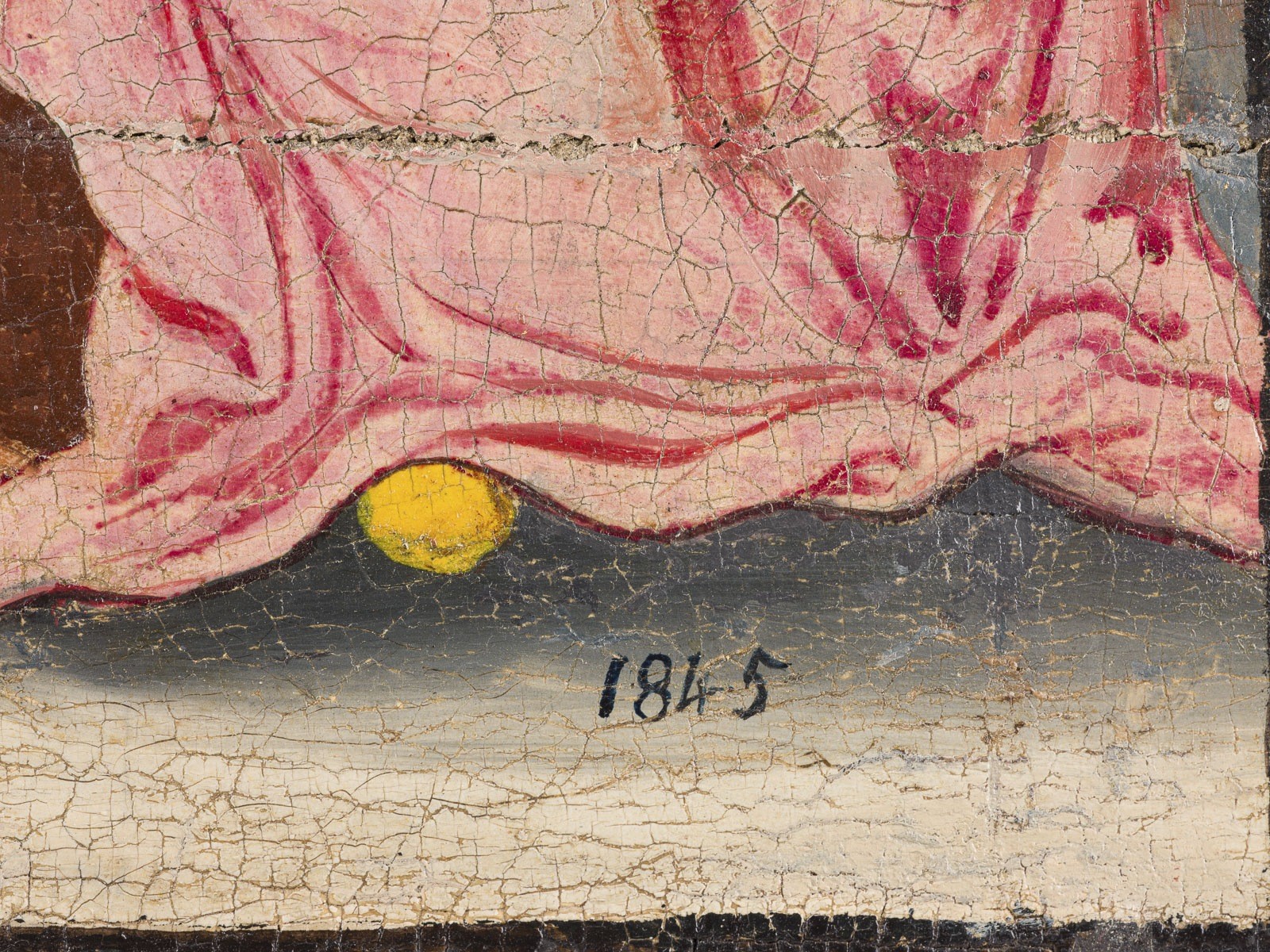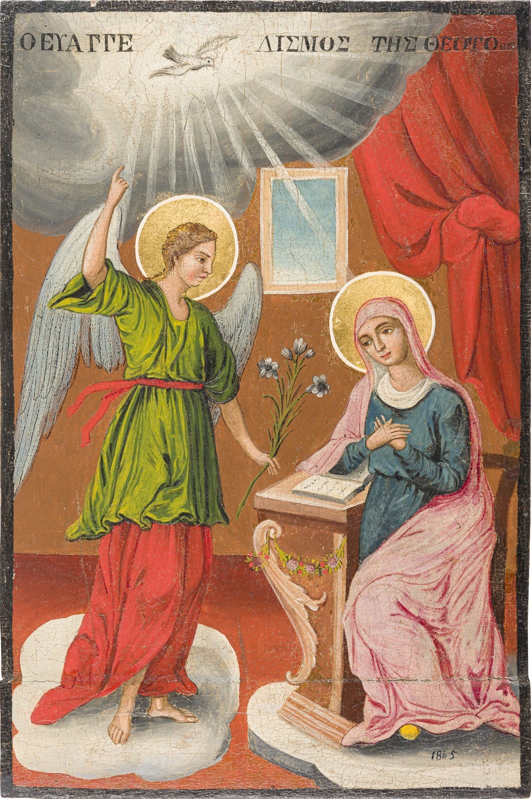 A LARGE DATED ICON SHOWING THE ANNUNCIATION OF THE MOTHER OF GOD Greek, dated 1845 Oil on wood panel. The haloes made of gold. Horizontal crack minimally restored. Dated '1845' lower right. 46.2 x 31.3 cm.