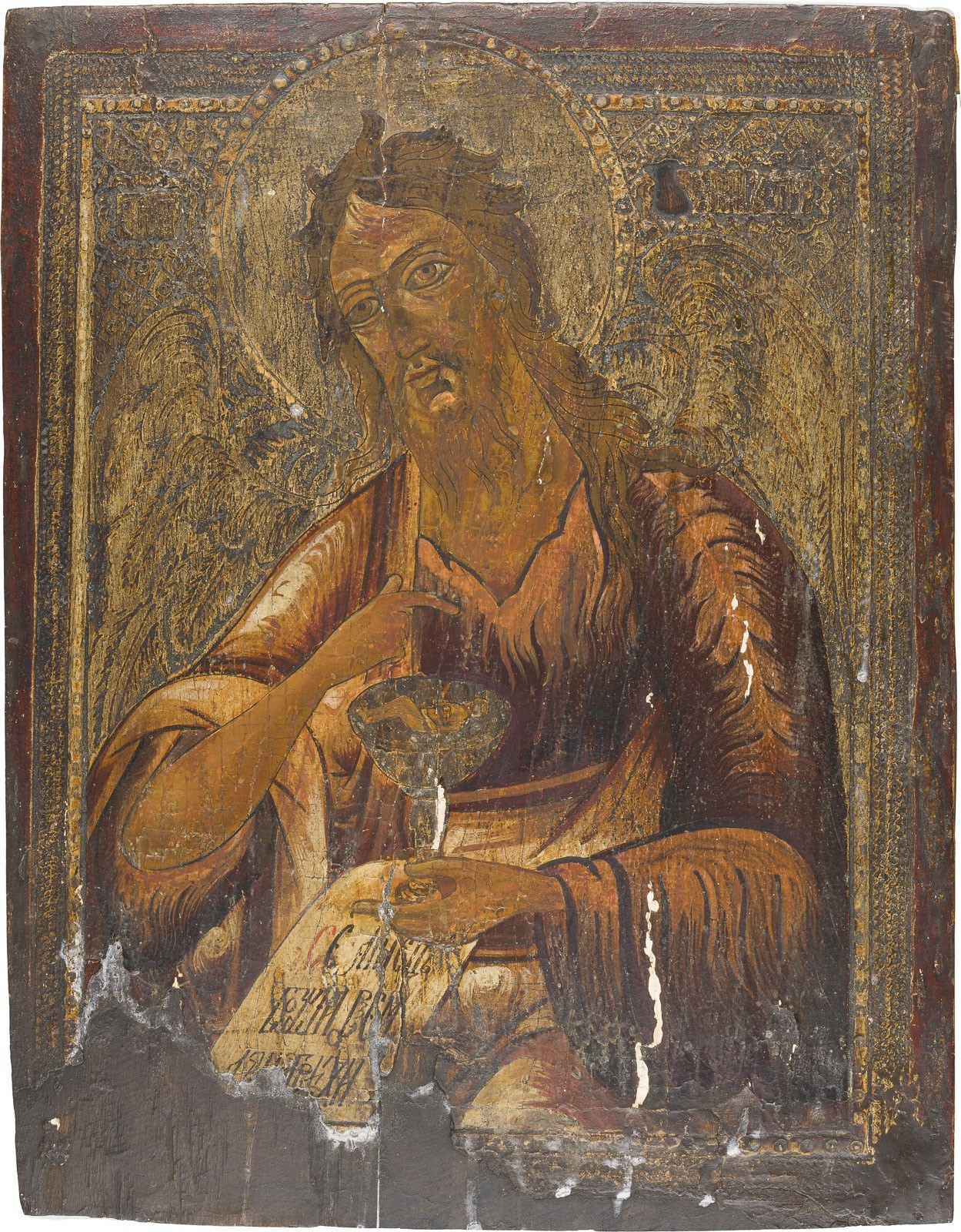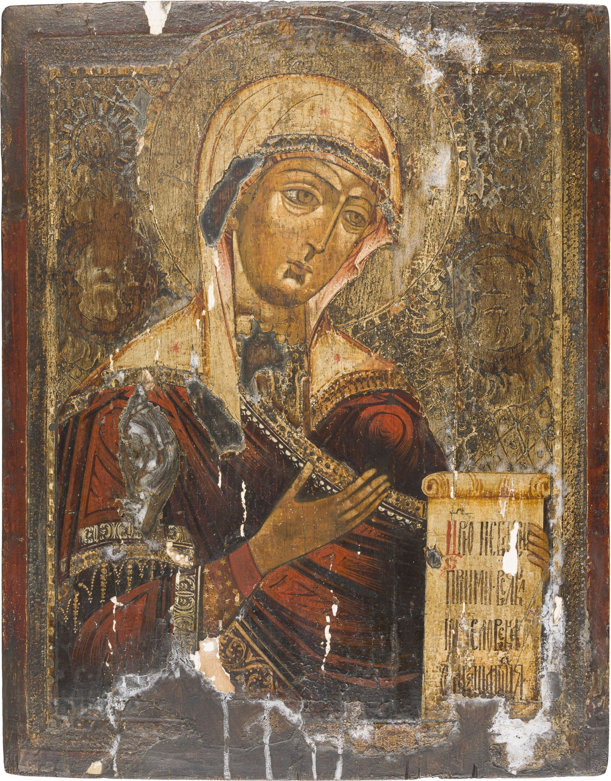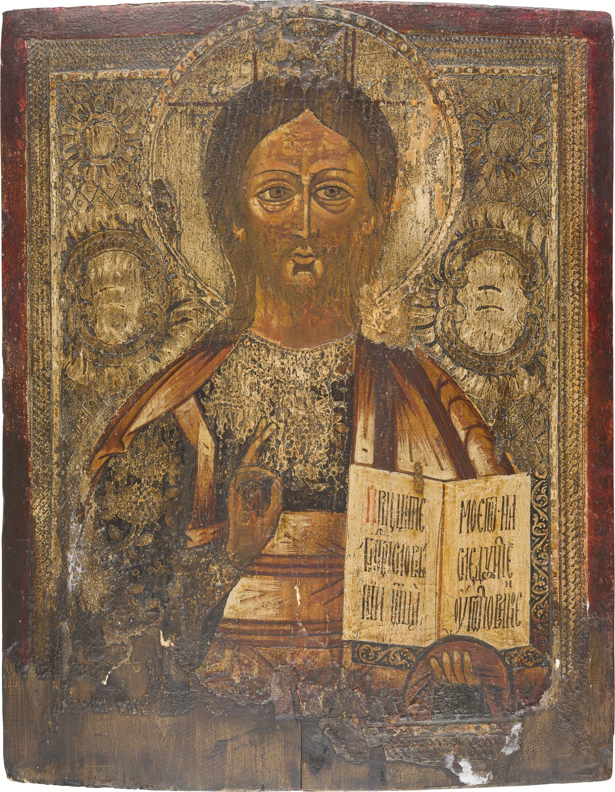 THREE PANELS FORMING A DEISIS: CHRIST PANTOKRATOR FLANKED BY THE MOTHER OF GOD AND ST. JOHN THE FORERUNNER Russian, 18th century Tempera on wood panels. The background made of silver, covered by a golden lacquer. The background ornately incised. Paint blisterings, losses, restorations. Each 47.5 x 37.7 cm.