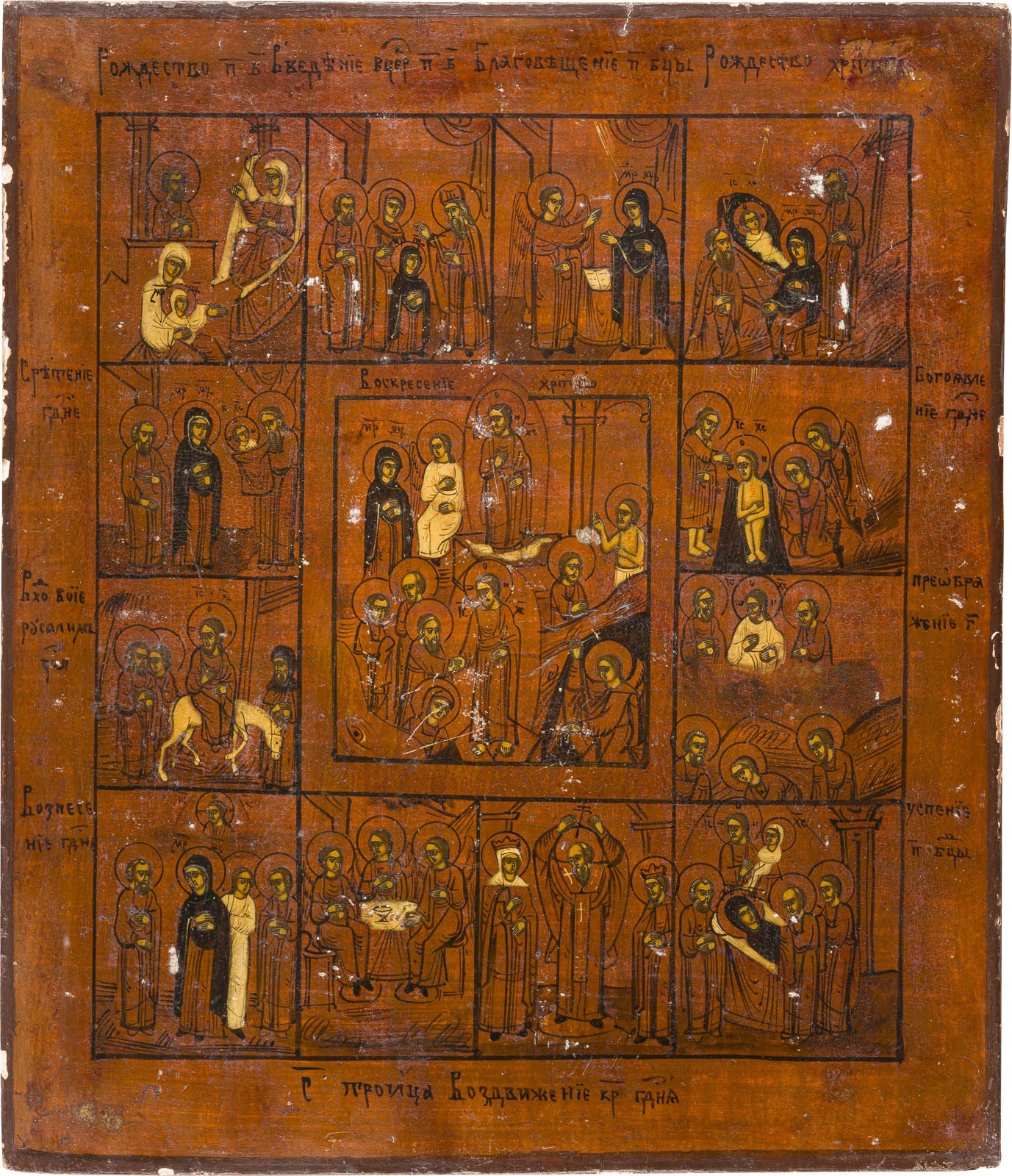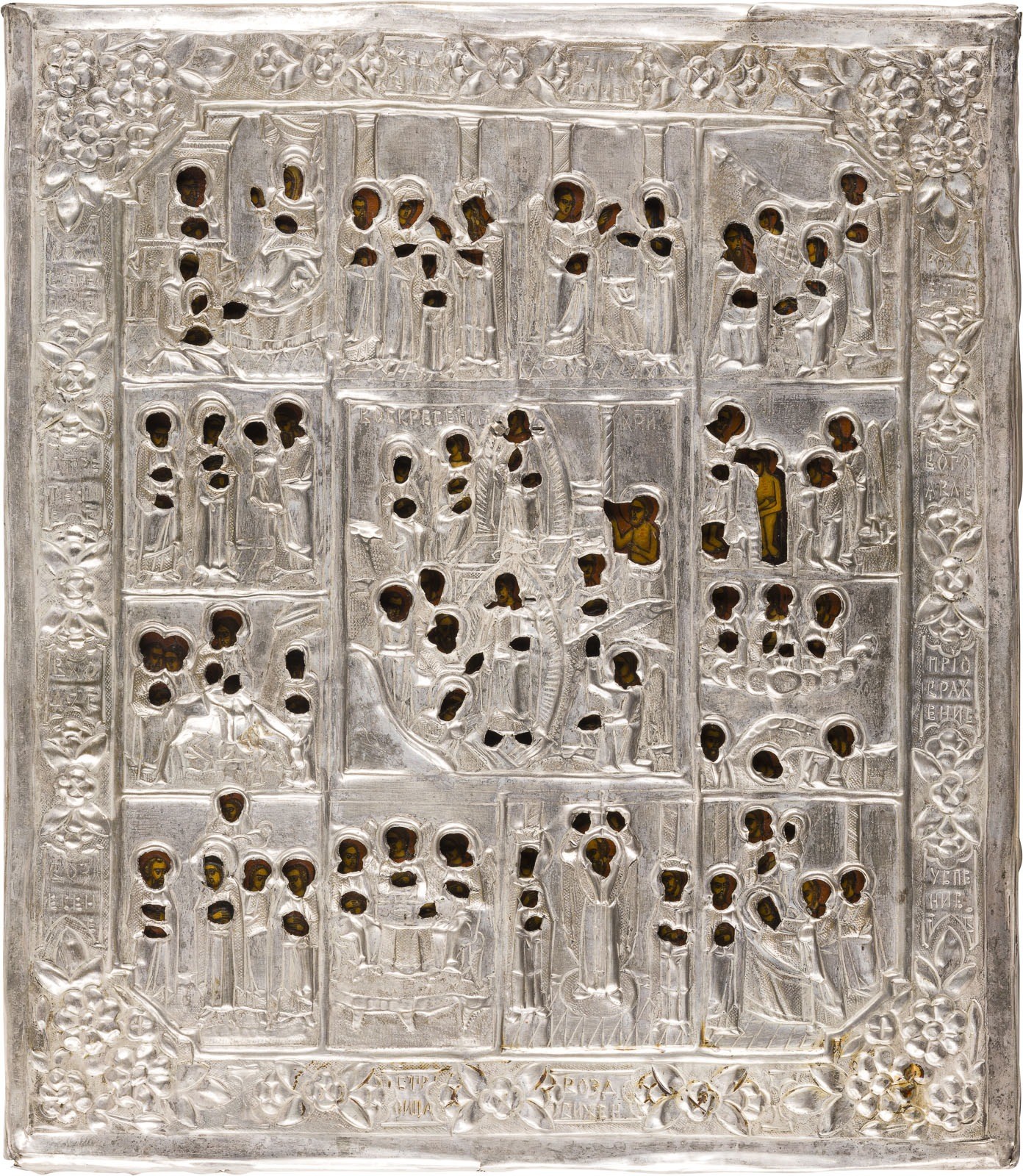 A LARGE ICON OF THE RESURRECTION OF CHRIST AND THE DESCENT AND THE MAJOR LITURGICAL FEASTS WITH OKLAD Russian, 19th century Tempera on wood panel. The metal oklad chased and repoussé. Minor losses. 35.5 x 31 cm.